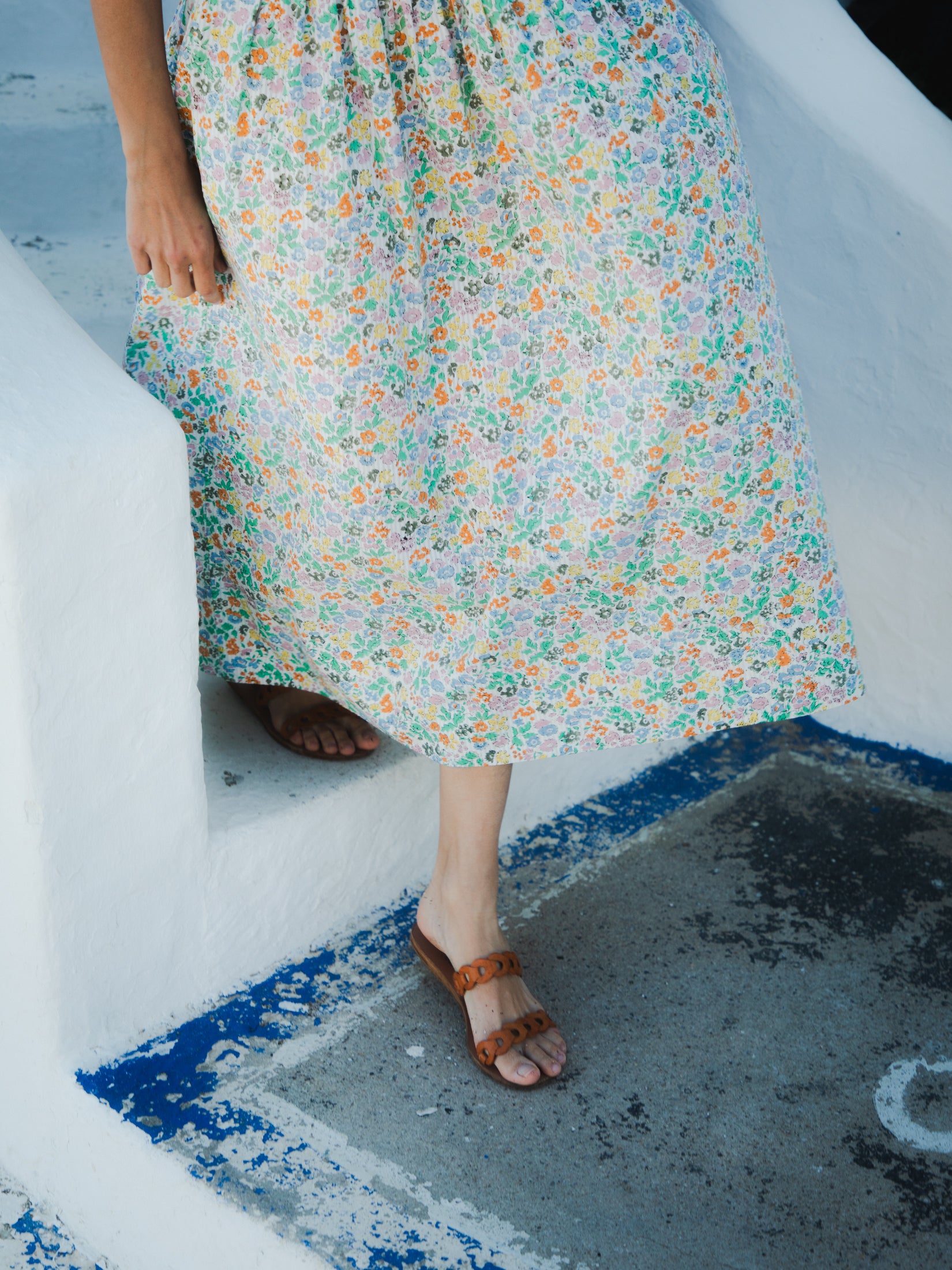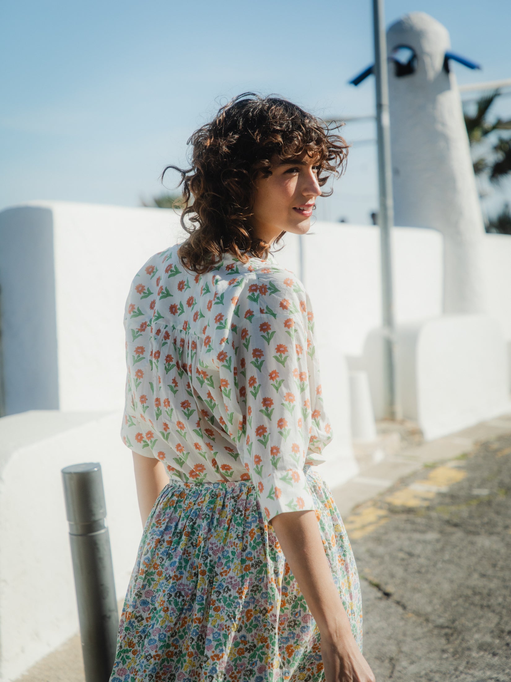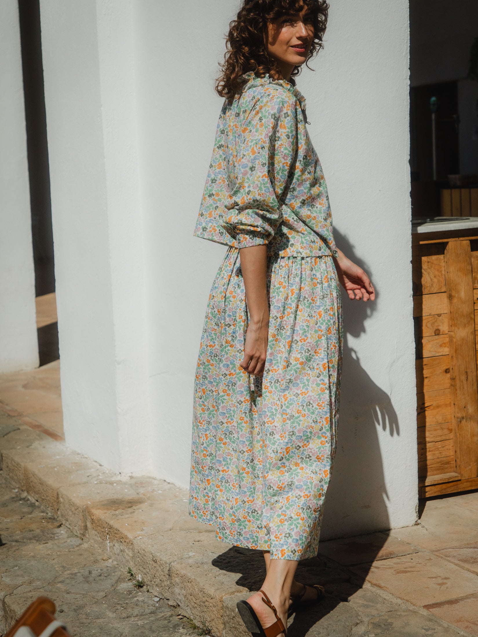 Our pretty and versatile Drew skirt, new for SS26. We love the deceptive simplicity of this piece - with its tiny waist pleats and expert blockprinting