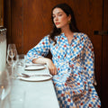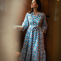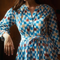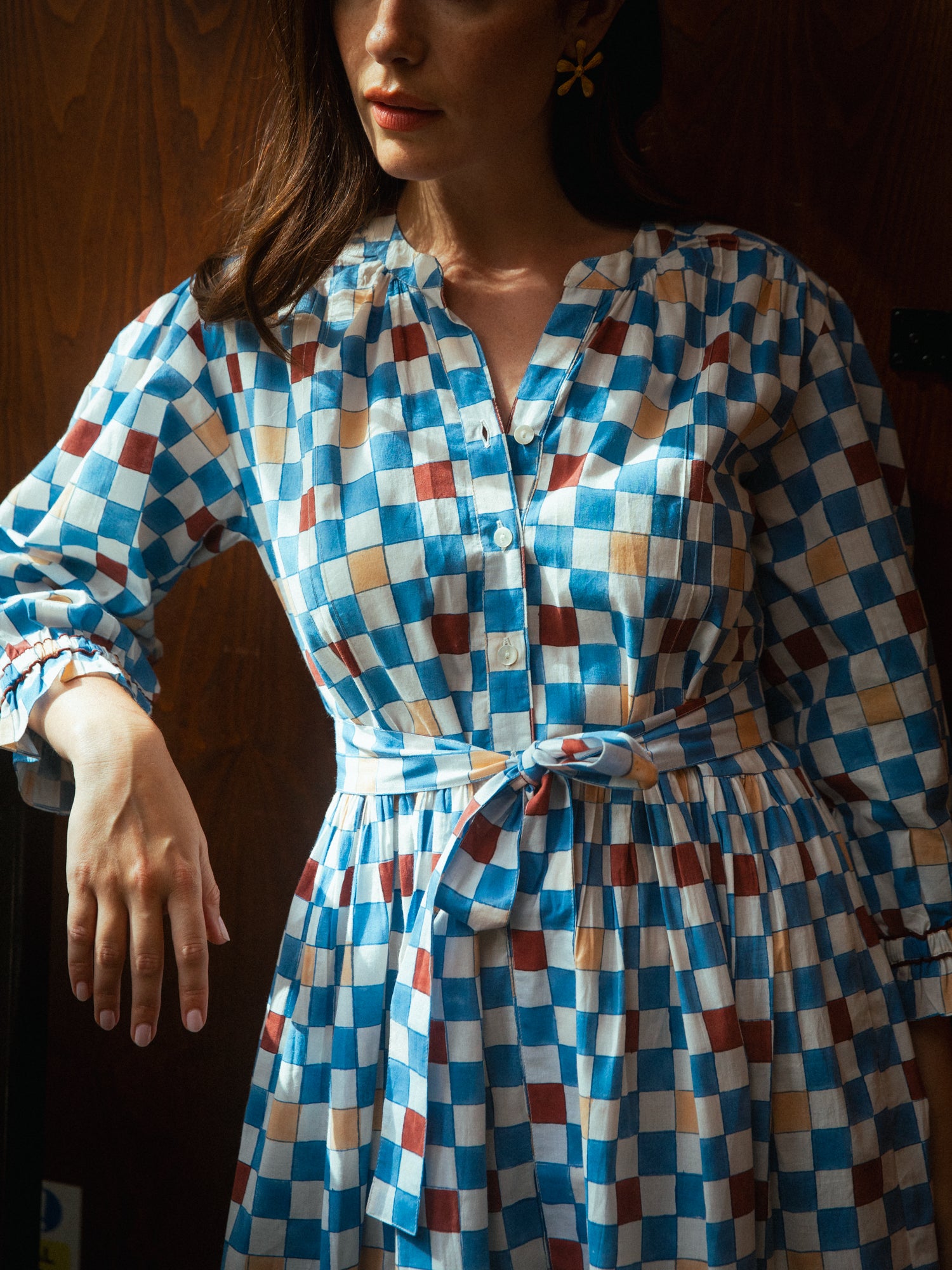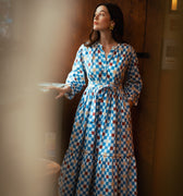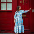 The Colette is a loose-fitting maxi-length dress. It features a close-buttoned front, pockets and comes with 2 belt options. One beautifully piped and quilted 'Tie-Back' belt and a simple sash belt which can be tied in a bow.