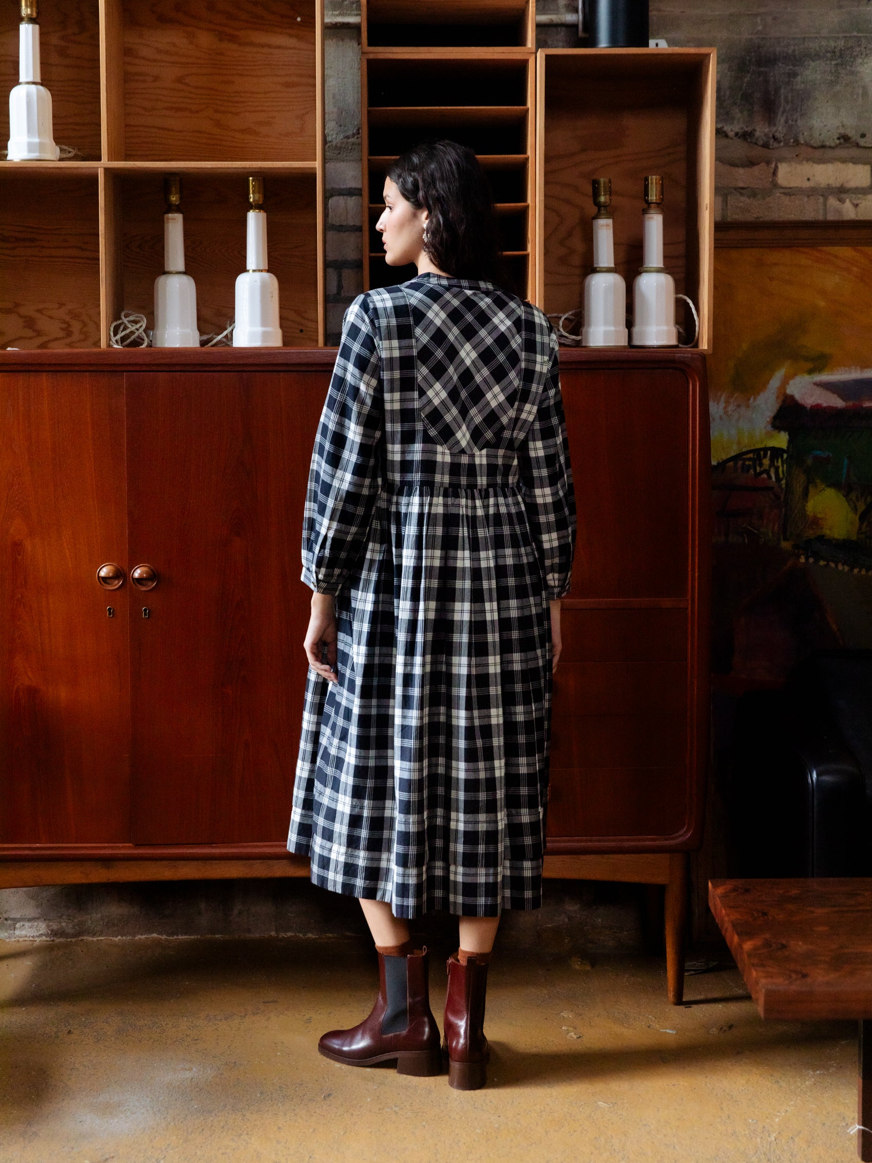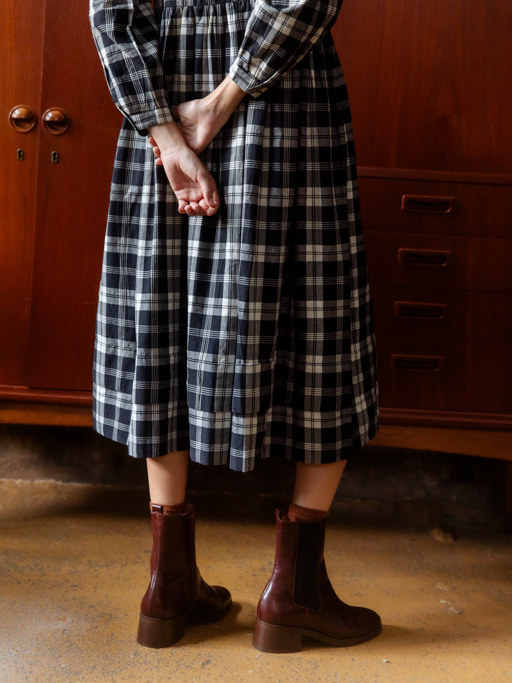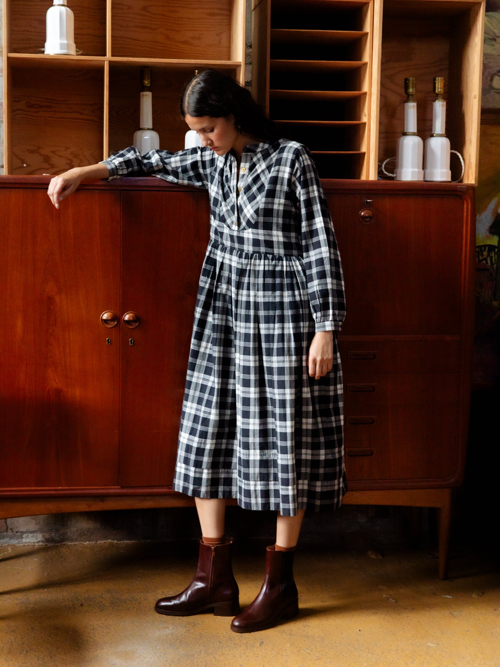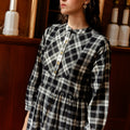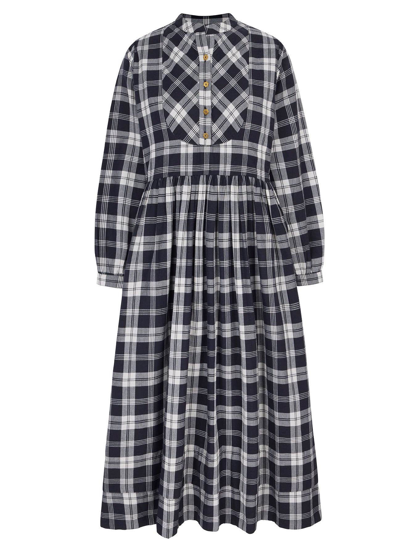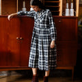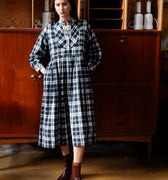 Our French Dress is inspired by an antique cotton shirt from Provence, easy fitting and with beautiful finishing and details. With knife pleats at the hem to add weight, hand-cast flower buttons in brass, this piece is stitched in a beautiful handwoven cotton check, faithfully reproducted from a French 19th century sample.