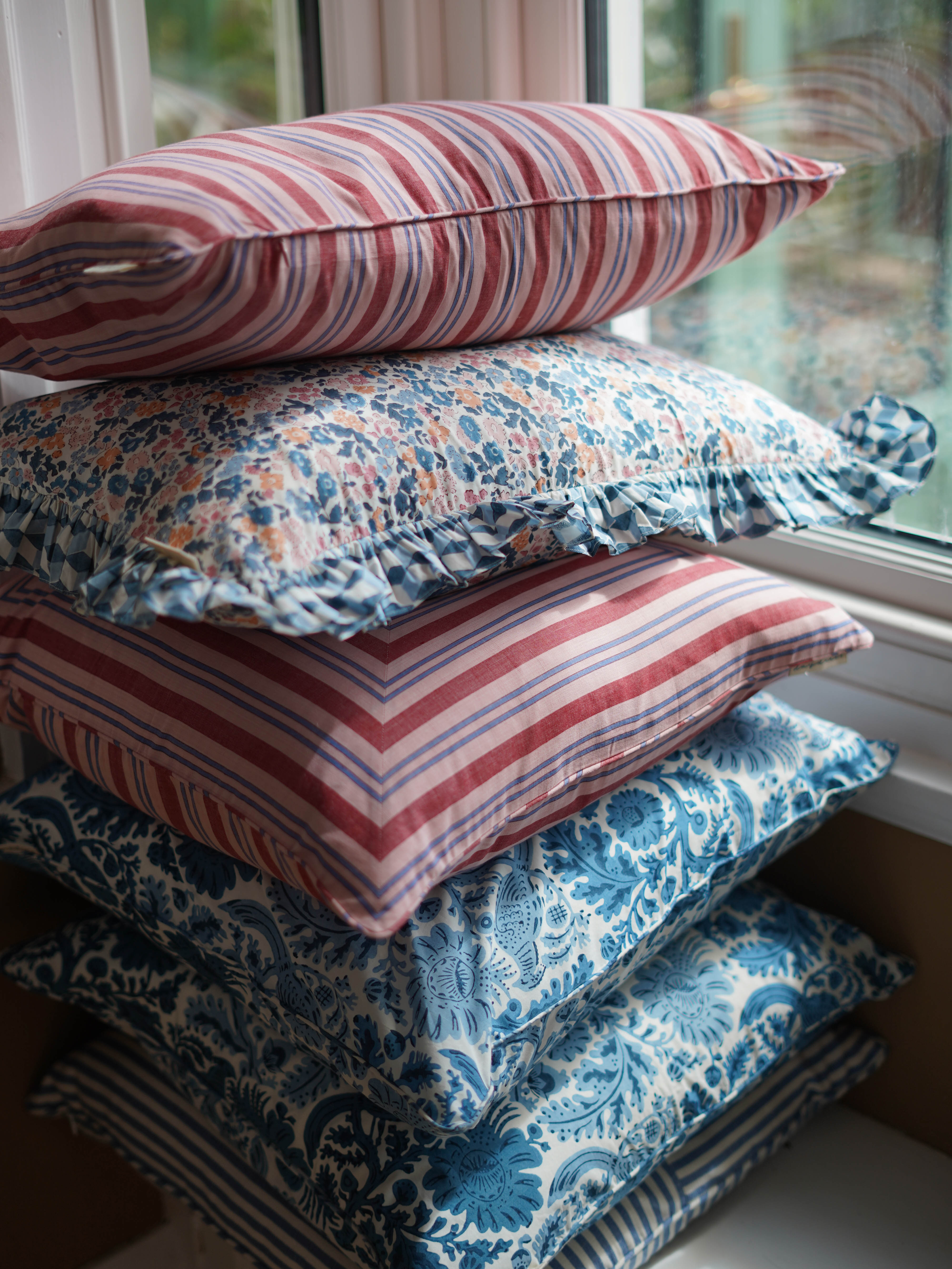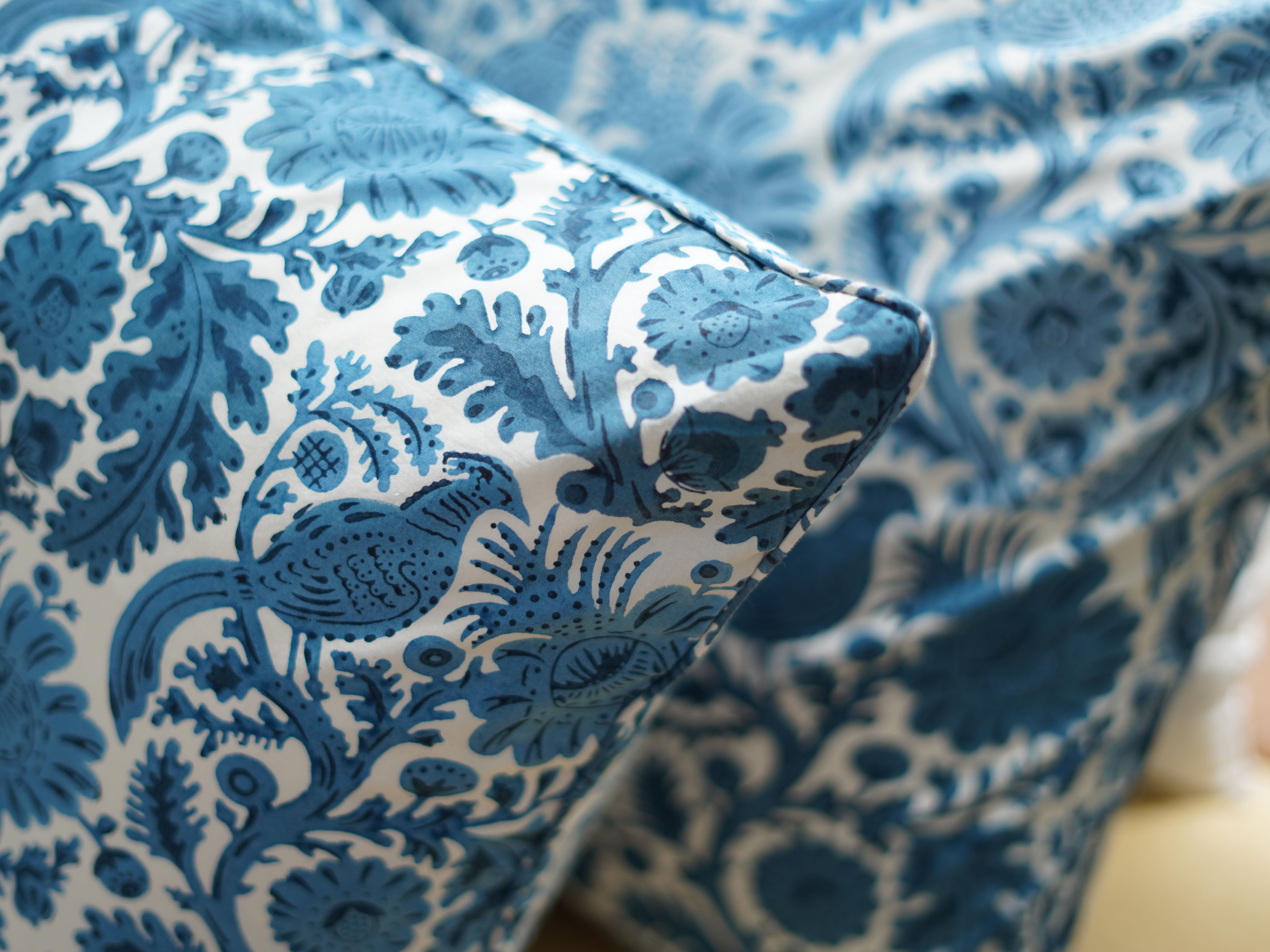 Cotton cushion cover in our classic block-print, Blue Pheasant in 3 tones of blue.