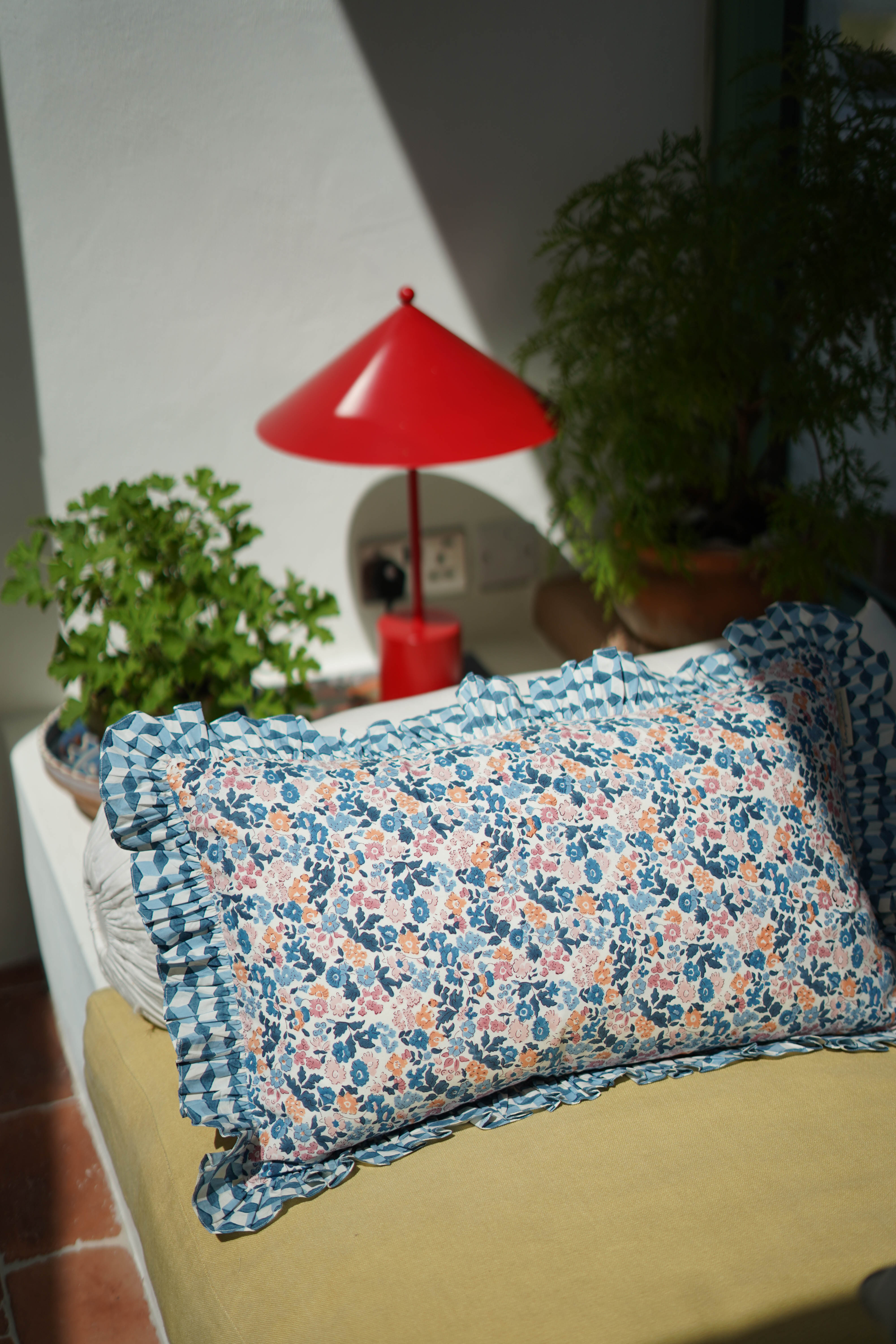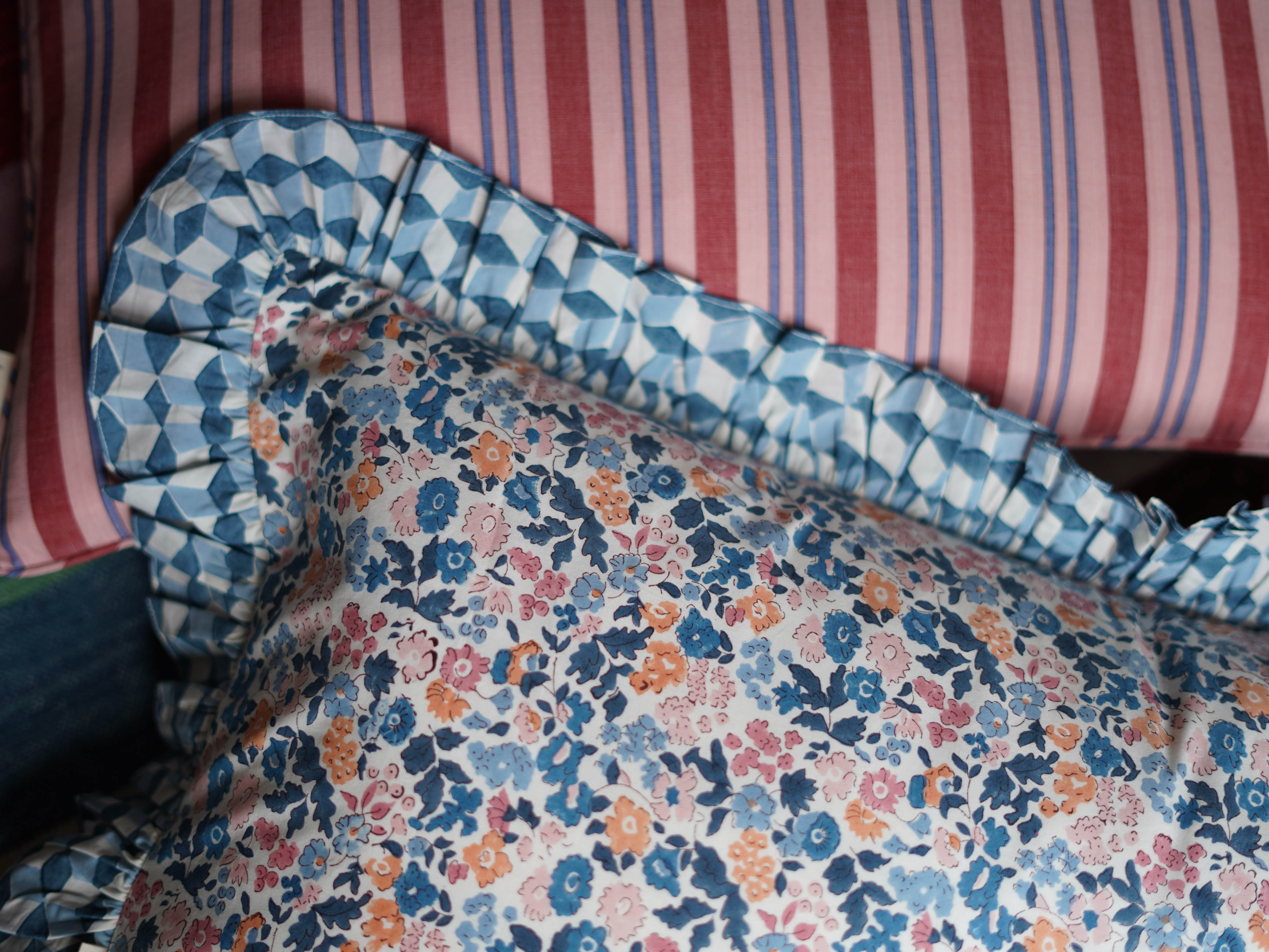 Frilled Cushion Cover, Fleures blue/blush 60 x 35cm