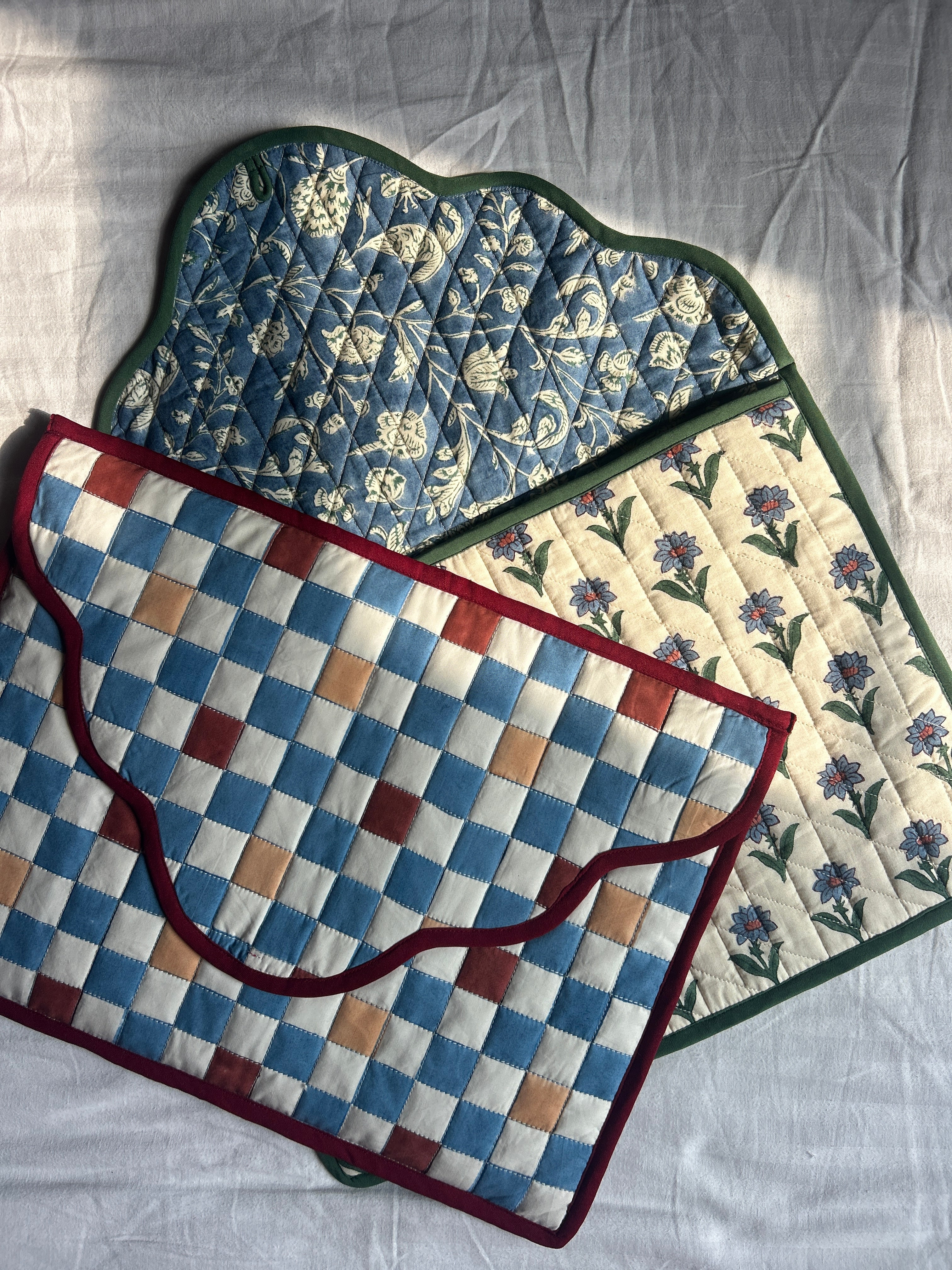 Perfect for 15" laptops and tablets, these pretty quilted cases would make a lovely addition to a home office or as an alternative to more traditional travel cases. Hand block printed with a contrast lining and a button closure.