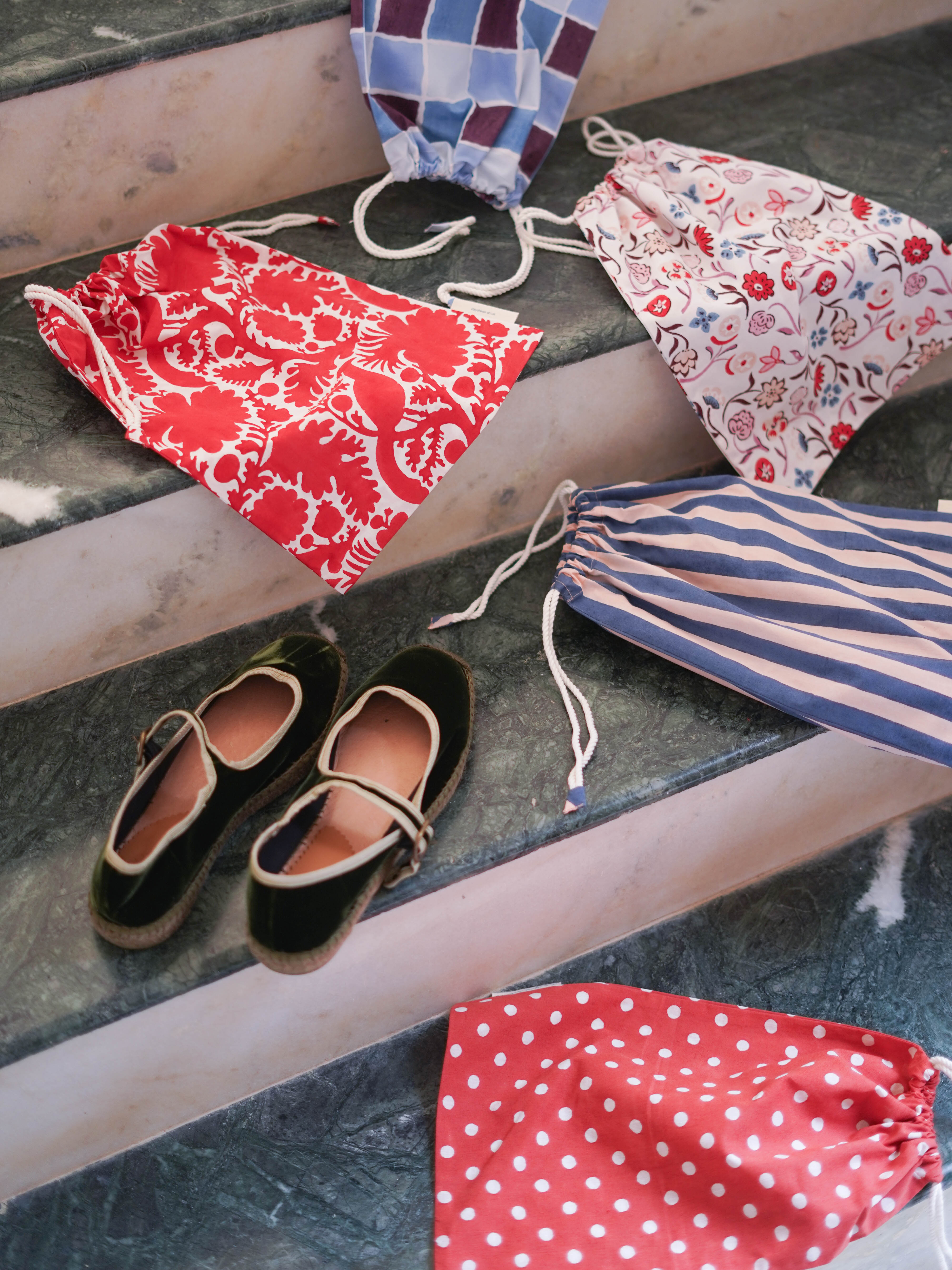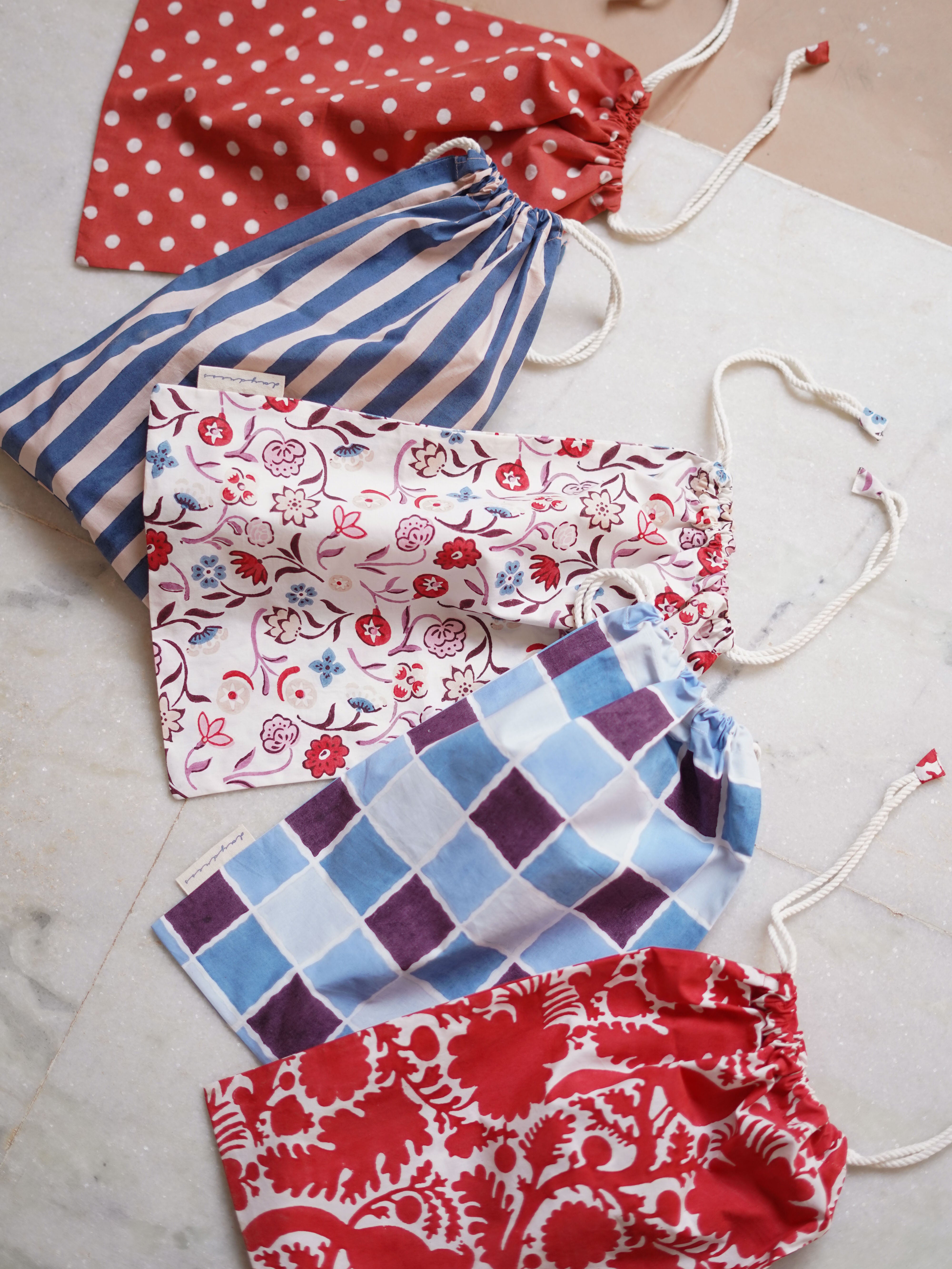 Another exercise in re-purposing fabric! We have made a few sets of 5 colourful cotton shoe-bags using leftover prints from the Daydress studio.