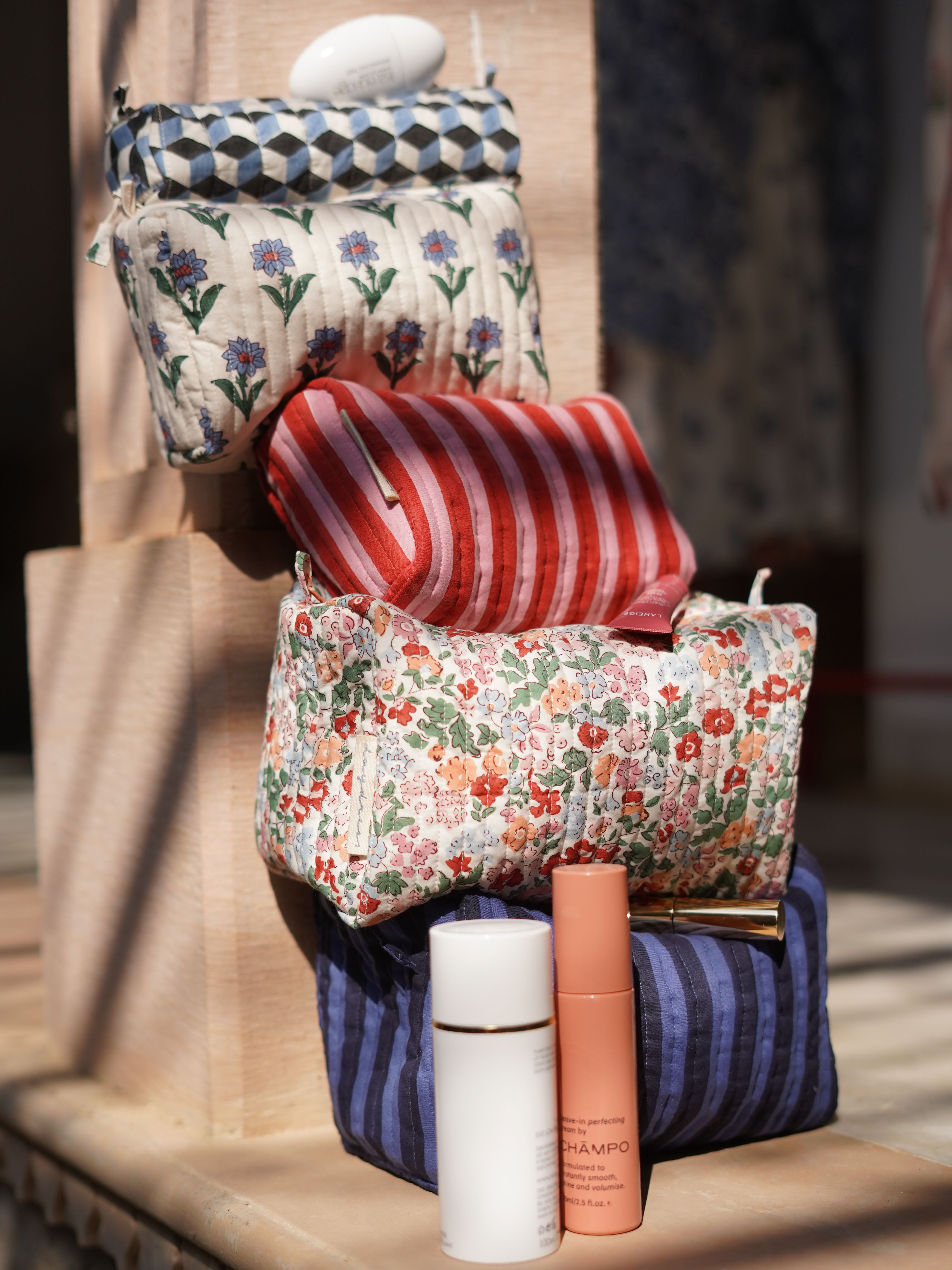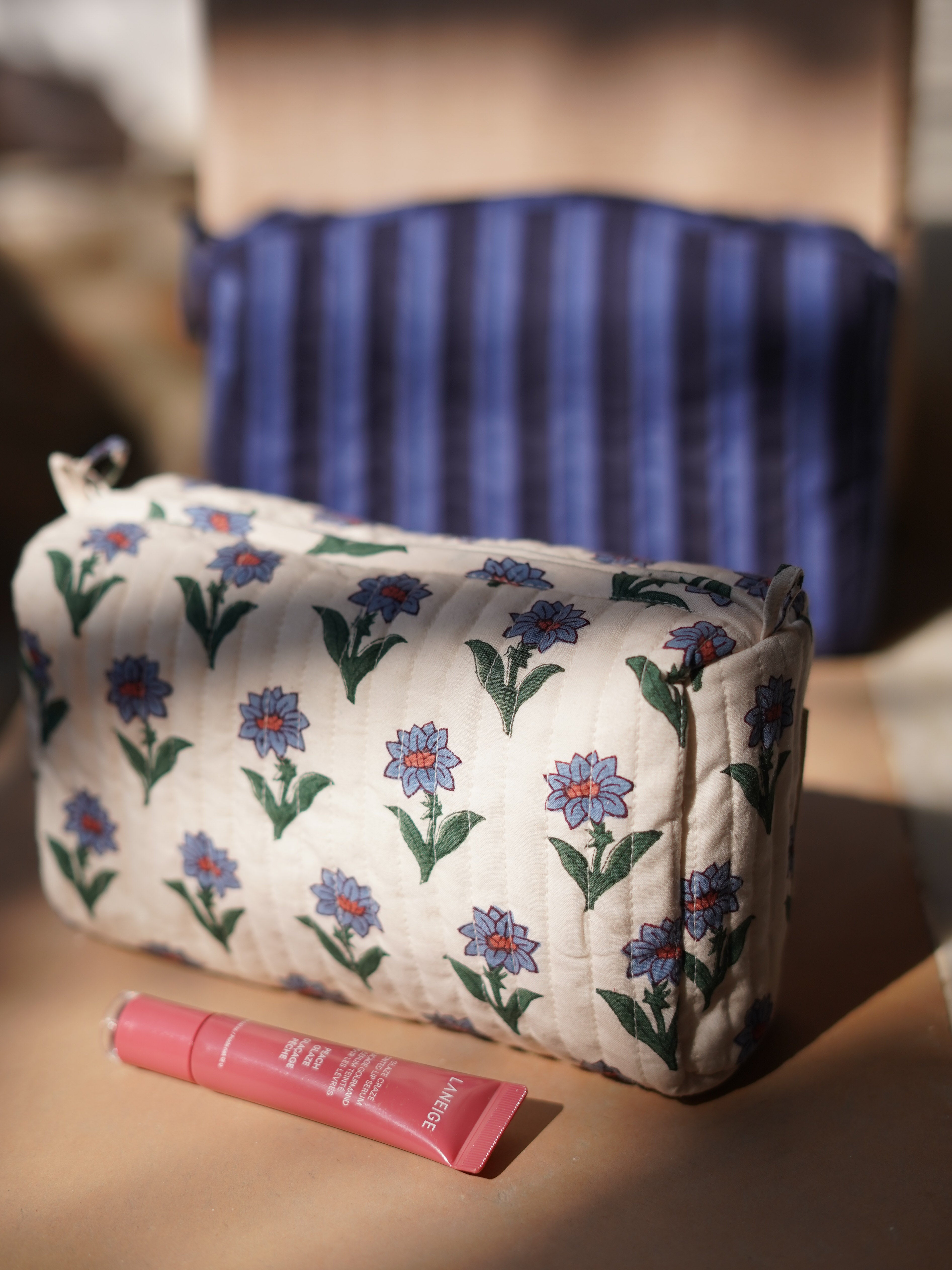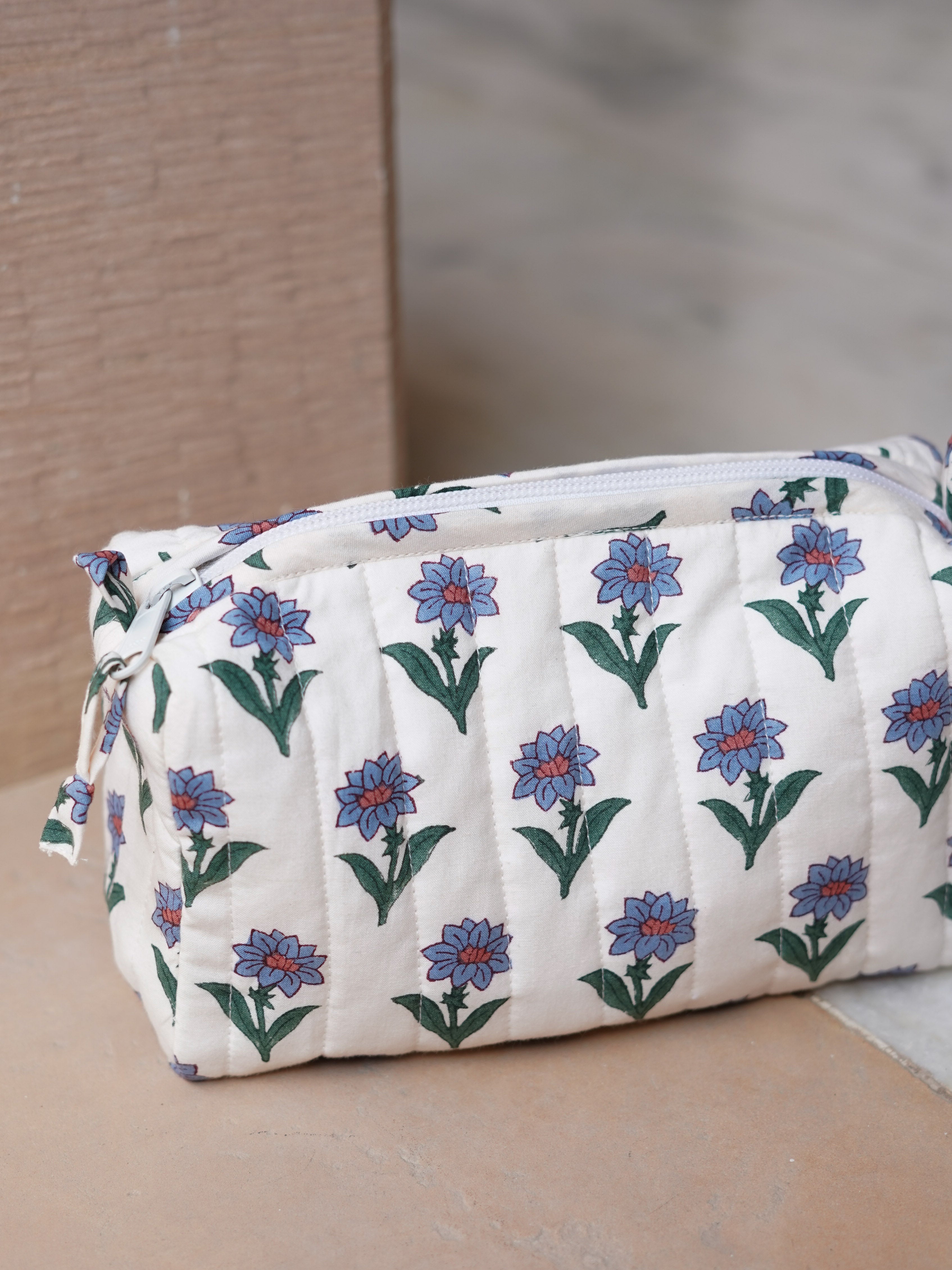 Our block-printed quilted cotton washbags will bring a welcome dose of pattern and colour to your bathroom at home and while travelling.