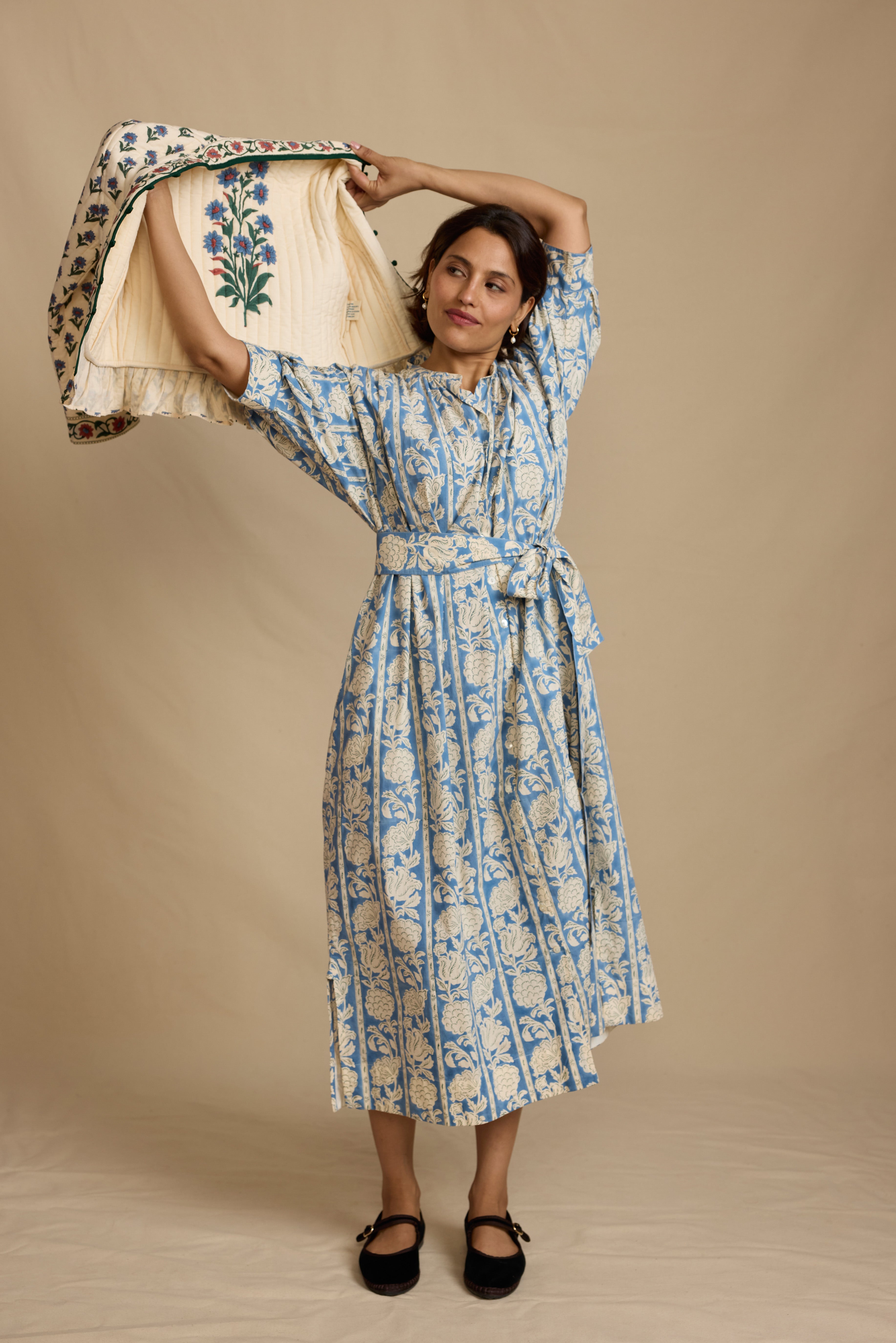 The Pierre is stitched from block printed cotton cambric, lined in a contrast spot block print with a frill at the hem and piped and finished with fabric knot and loop bottoms.