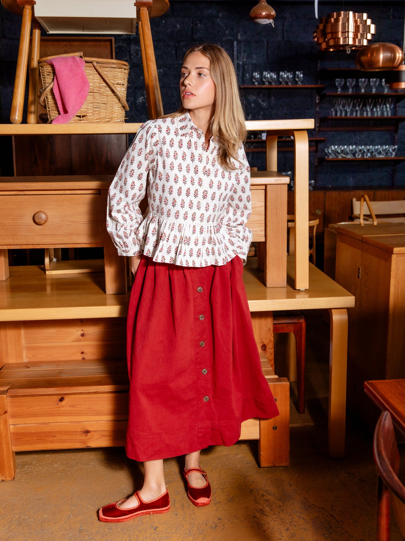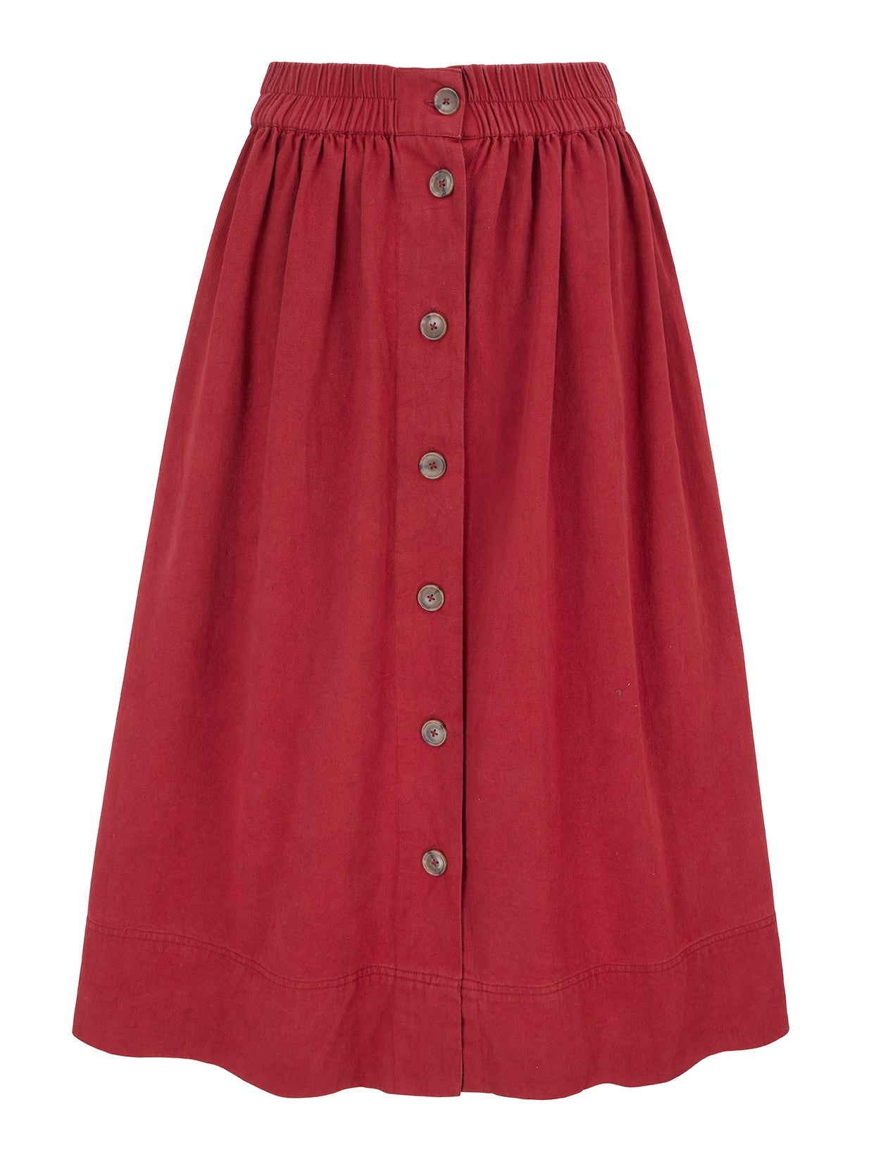 A simple button-down skirt in a warm spice coloured cotton twill, designed to work hard with all your favourite winter layers, bringing a little structure and richness in colour
