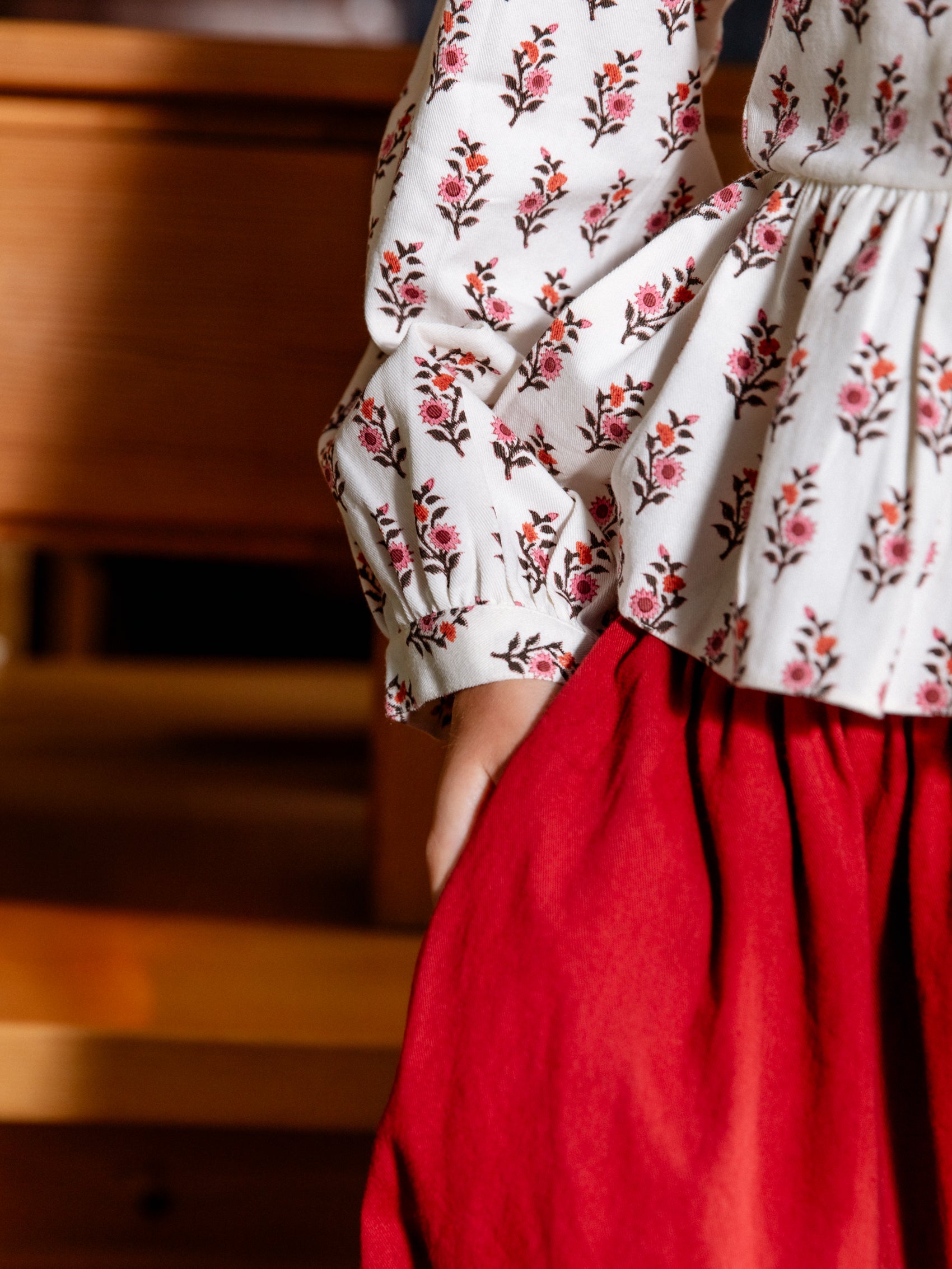 This skirt was block-printed, cut, stitched and finished entirely with our close partners in Jaipur. Our garments are produced in very small batches to ensure exclusivity and complete control and care in production.