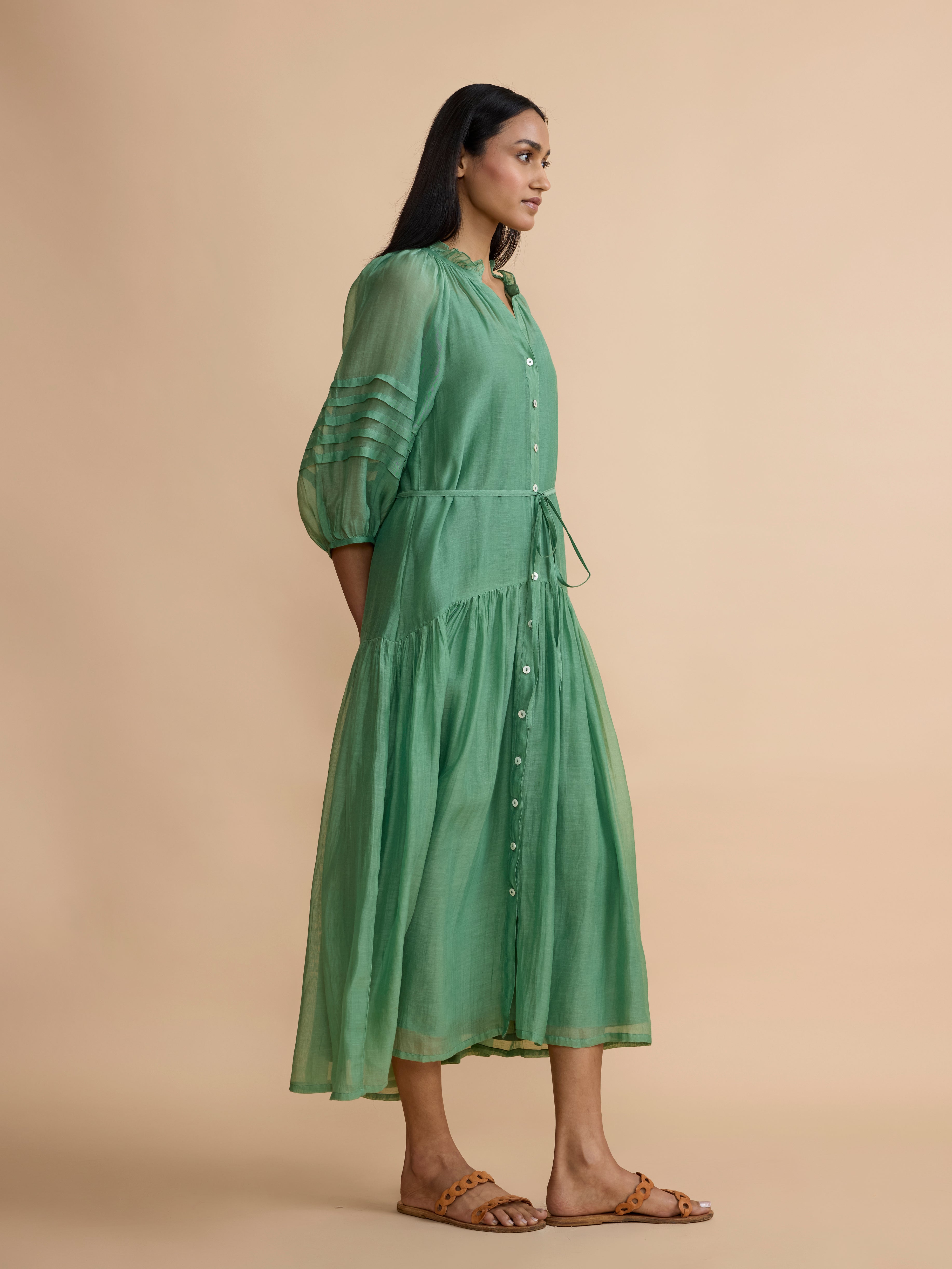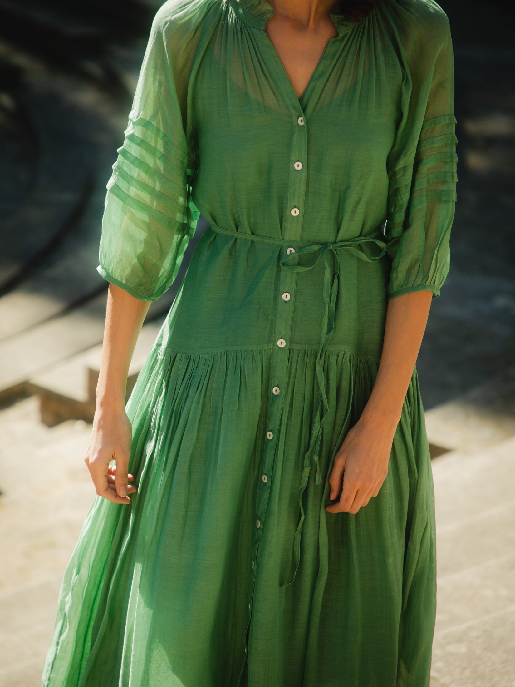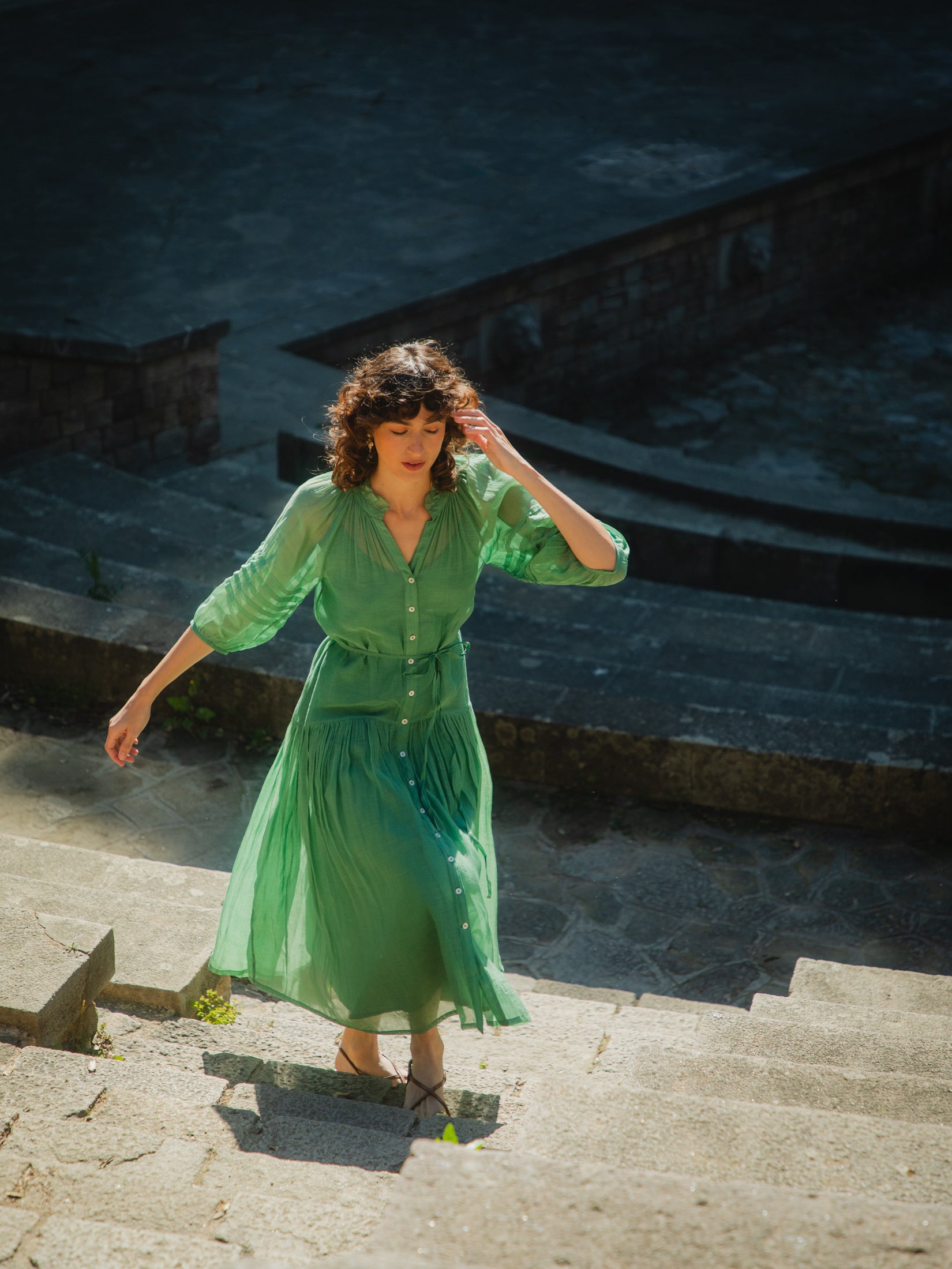 Our new Hudson is an elegant cotton/silk shirt dress full of fine details to help it travel with ease from daytime to informal events. With a dropped curved waist, shoe-lace belt with delicate knife-pleats to the sleeves.