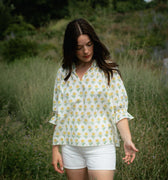 A beautifully relaxed shirt, made from light cambric cotton, cut with a raglan sleeve and with an easy, open neckline with optional button closure. This top is unlined for coolness and comfort in hotter weather.