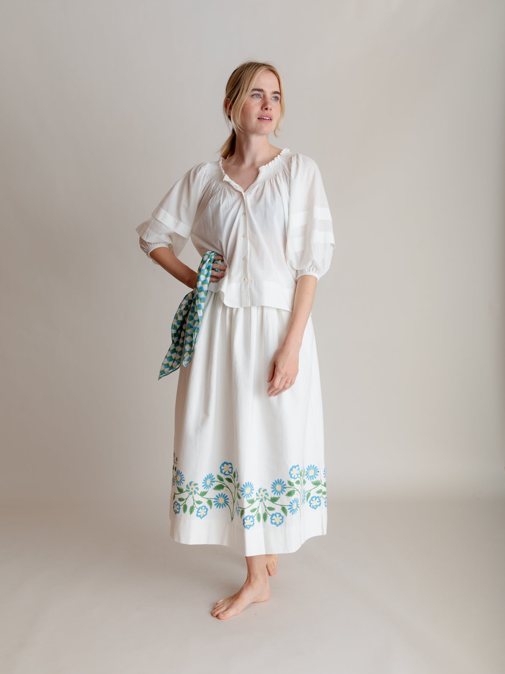 This piece was block printed, cut, stitched and finished entirely with our close partners in Jaipur. Our garments are produced in very small batches to ensure exclusivity and complete control and care in production.
