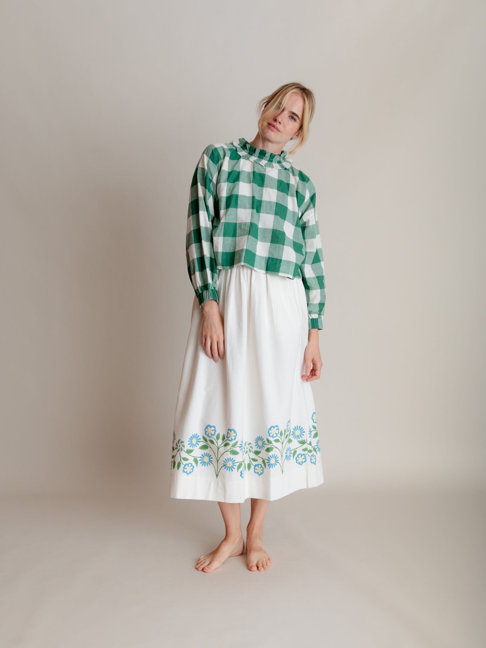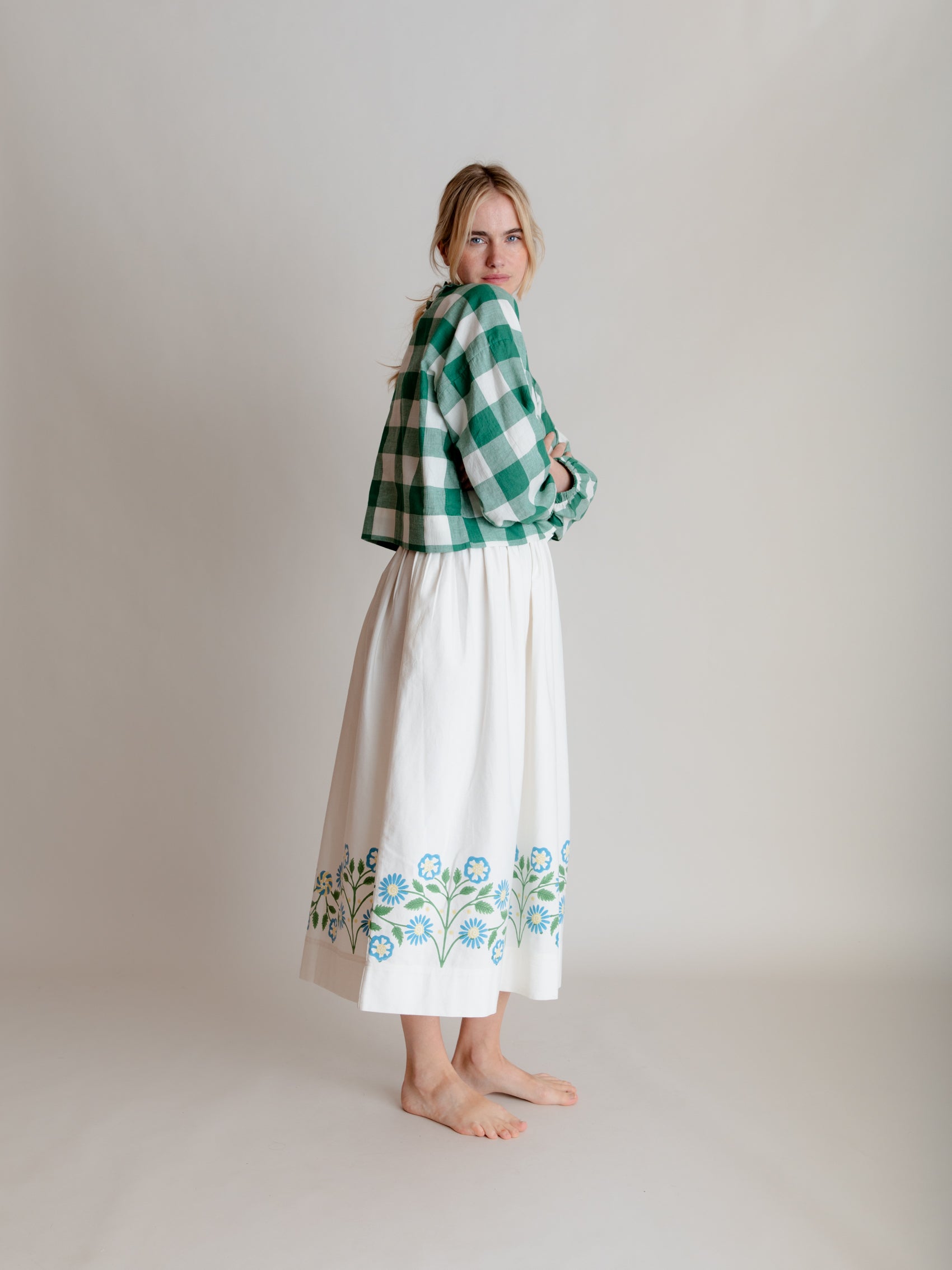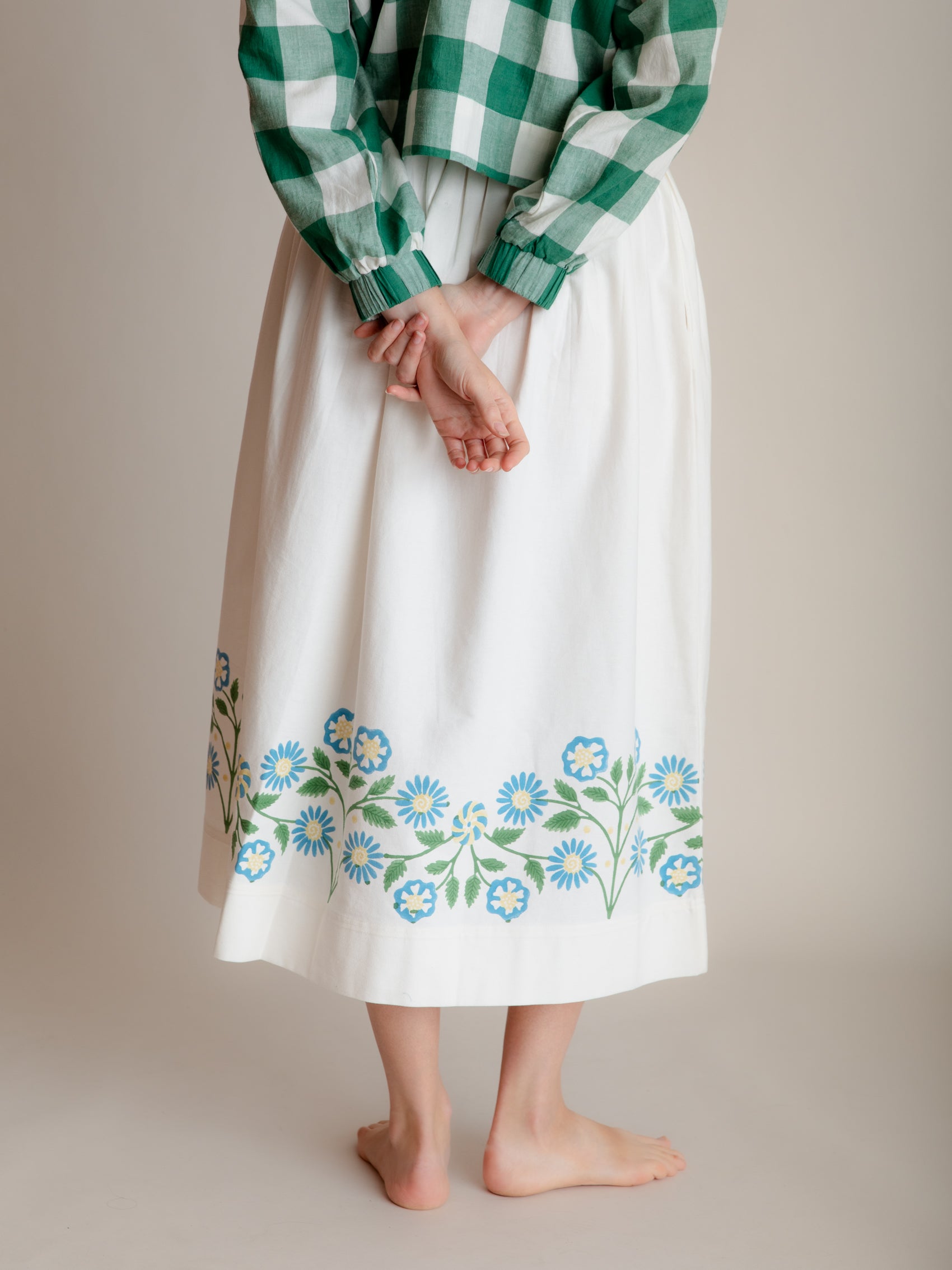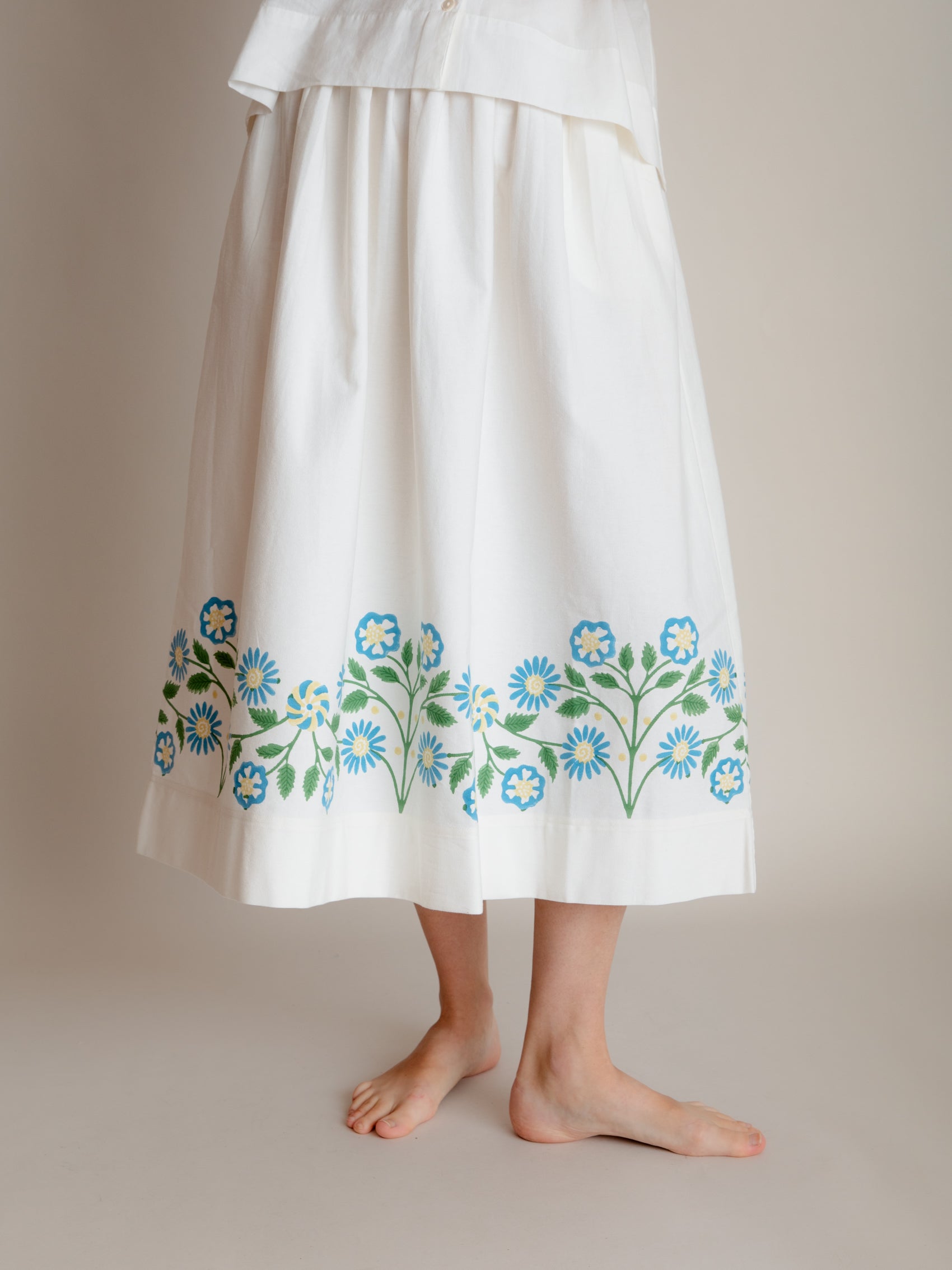 A lovely, simple gathered skirt in twill with a striking hand-block printed border at the hem.