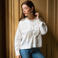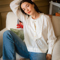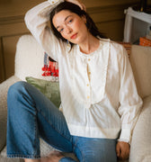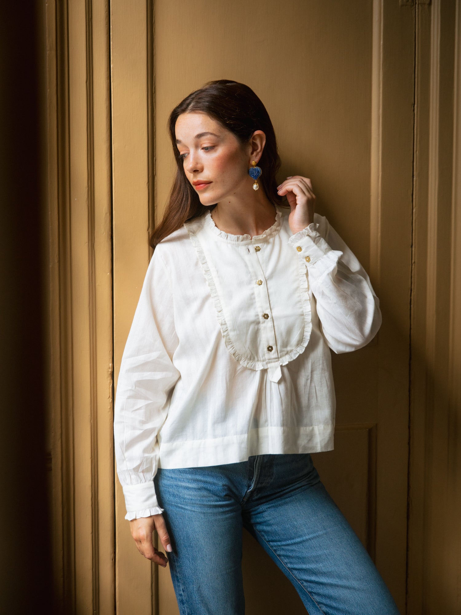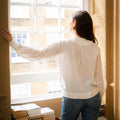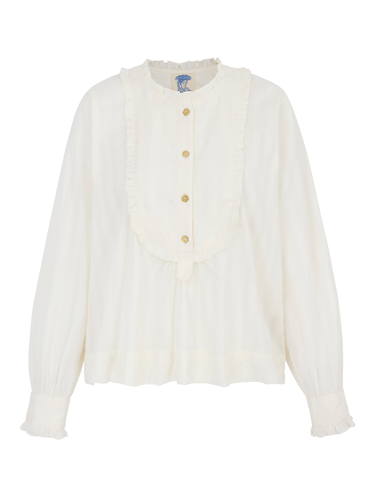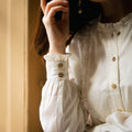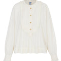 A beautifully soft and easy shirt in a subtle natural white striped cotton with frilled bib detail and hand-cast brass flower buttons