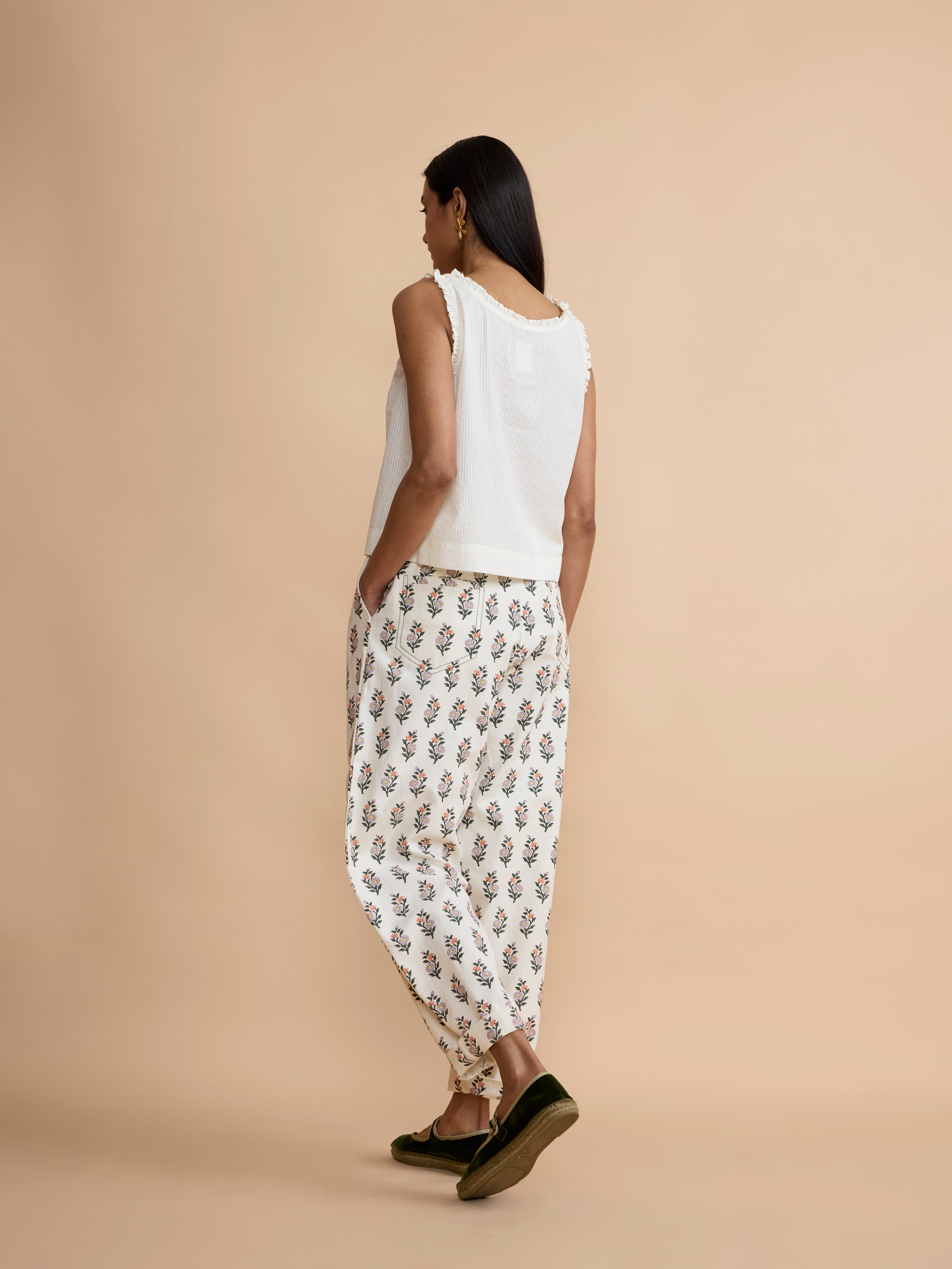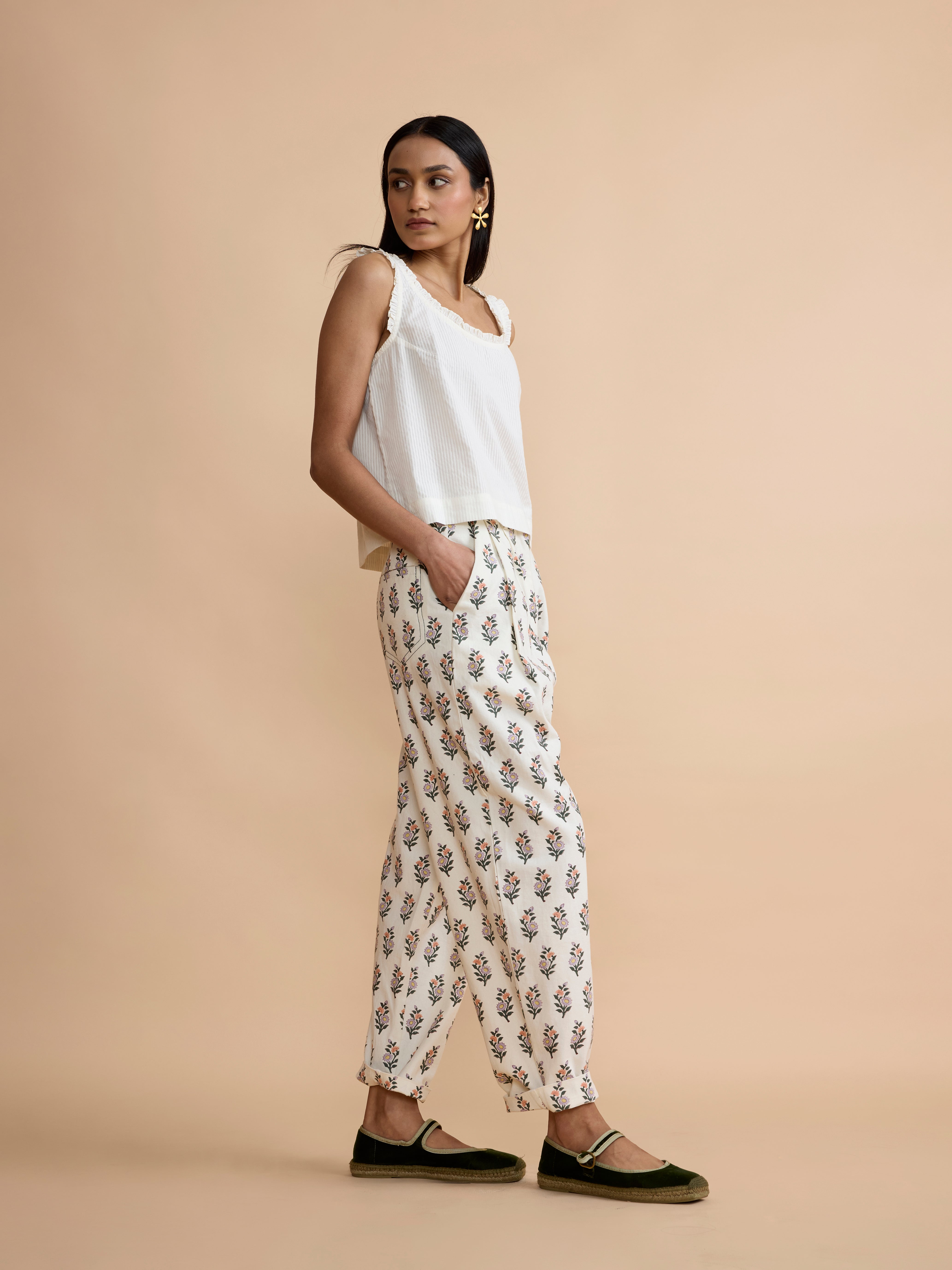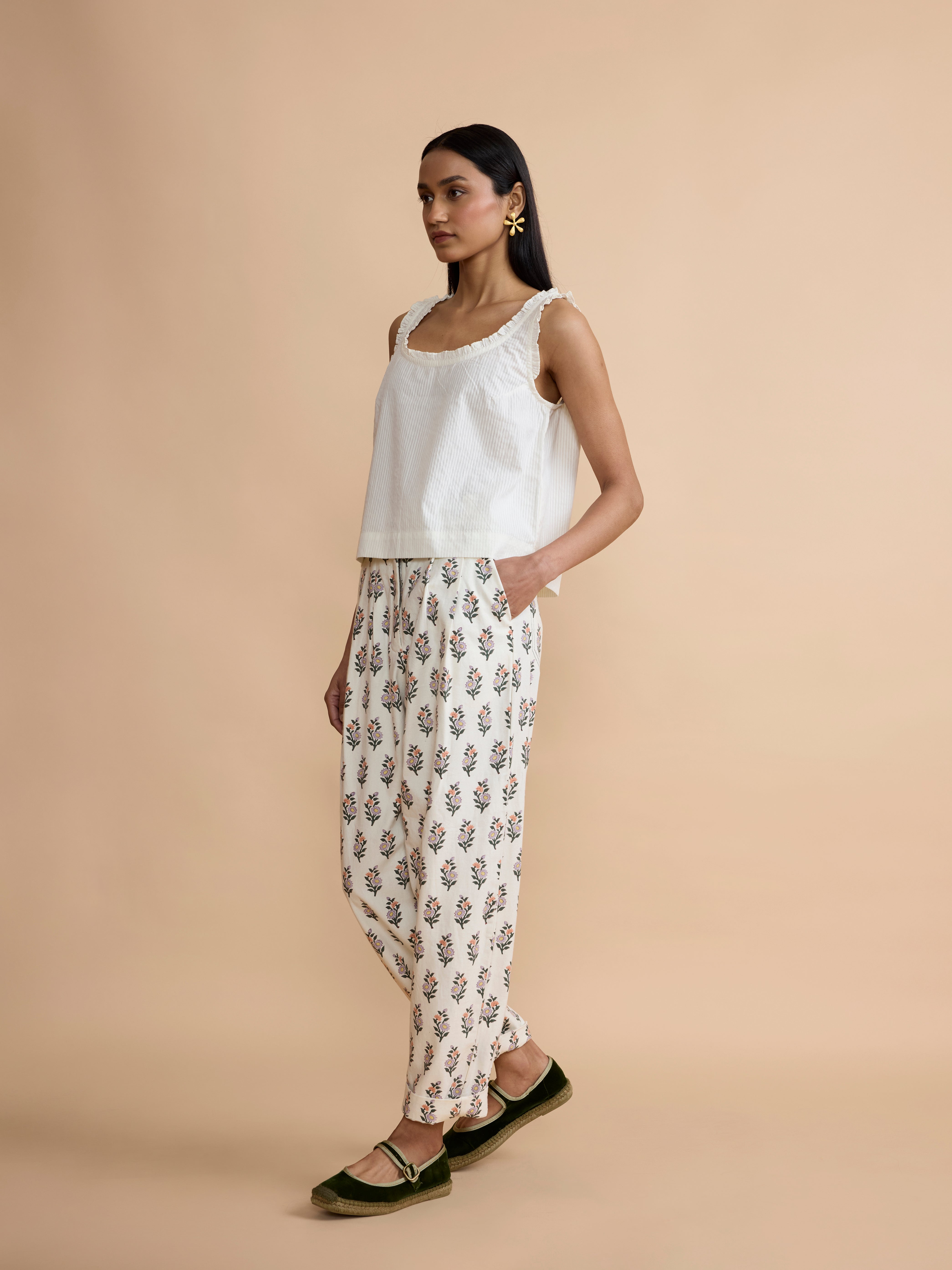 Our new double pleated Betty trousers are stitched in a block-printed cotton twill and combine a high rise with a wide leg that tapers and sits at the ankle.