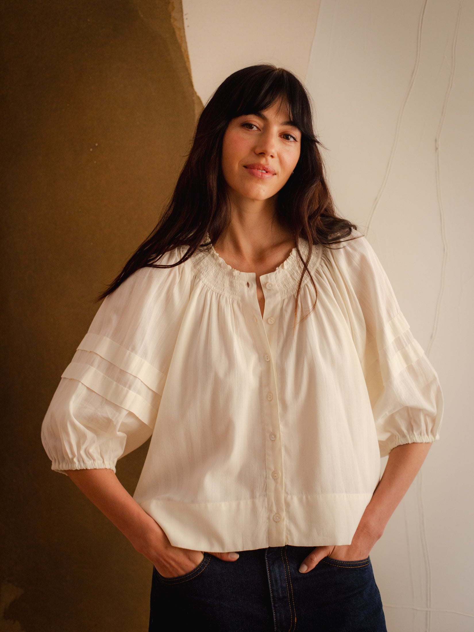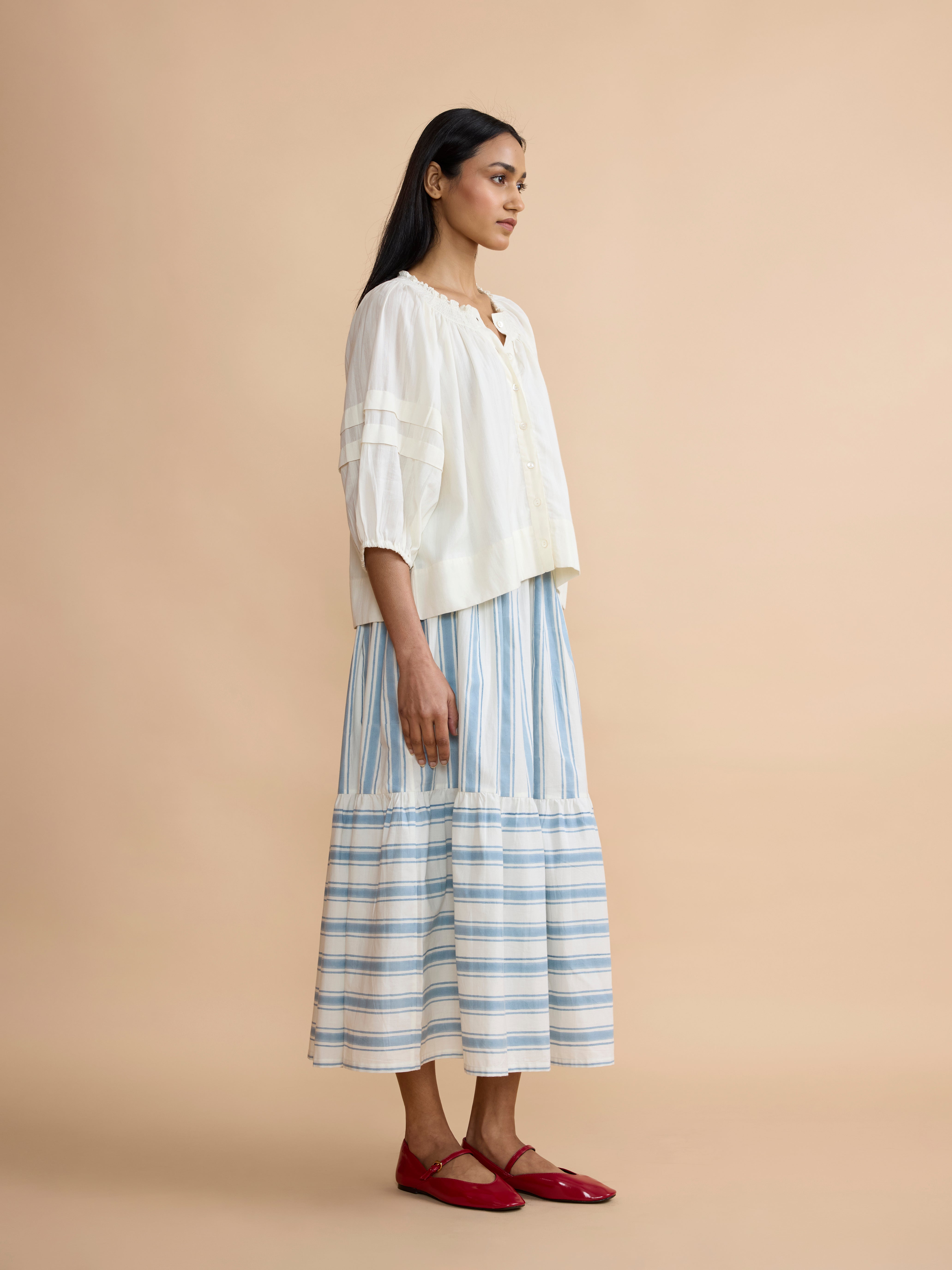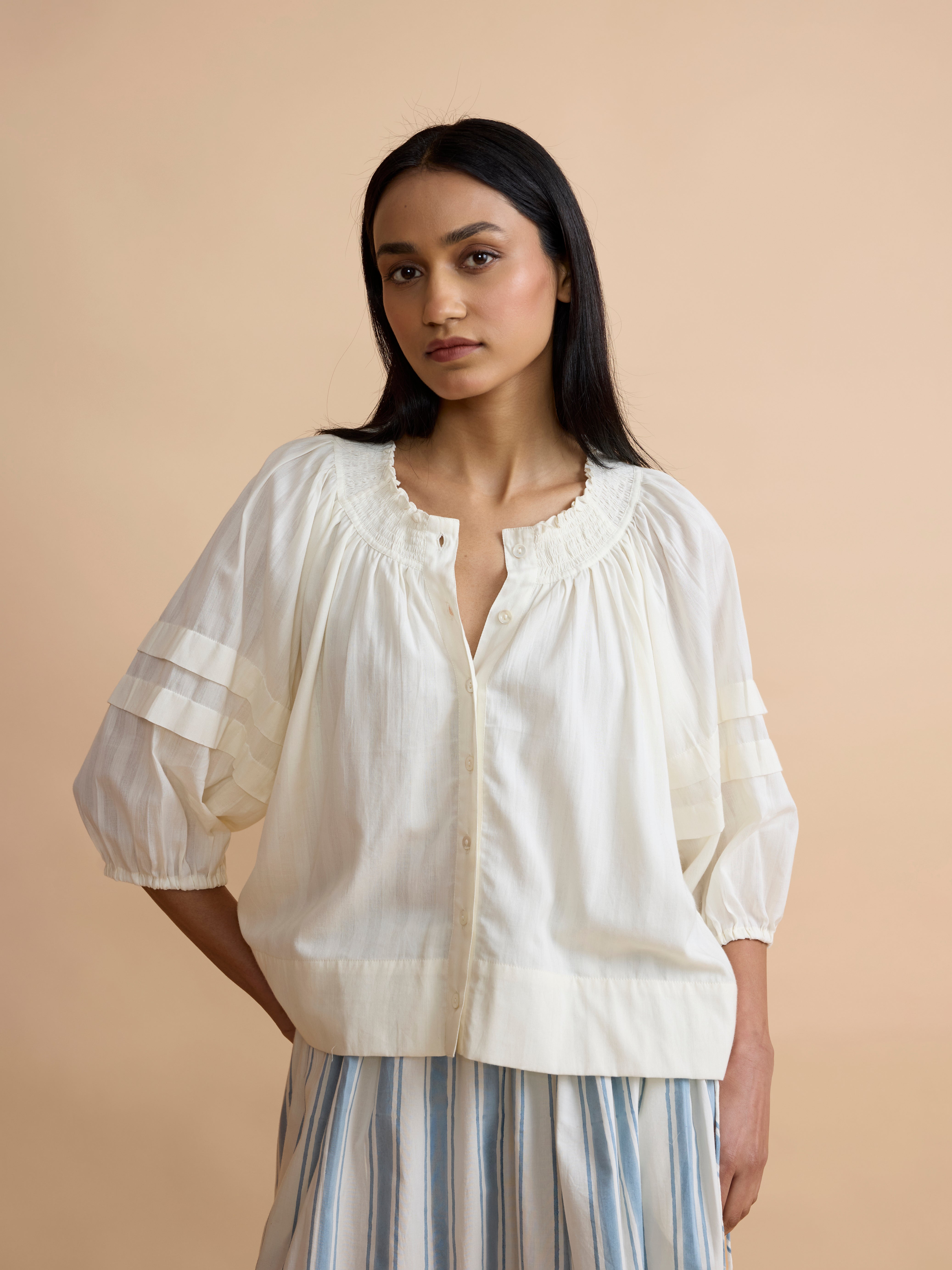 A versatile and simple cotton blouse with a subtle woven stripe detail. The gathered neckline and knife pleats on the sleeves add vintage definition to the contemporary shape.