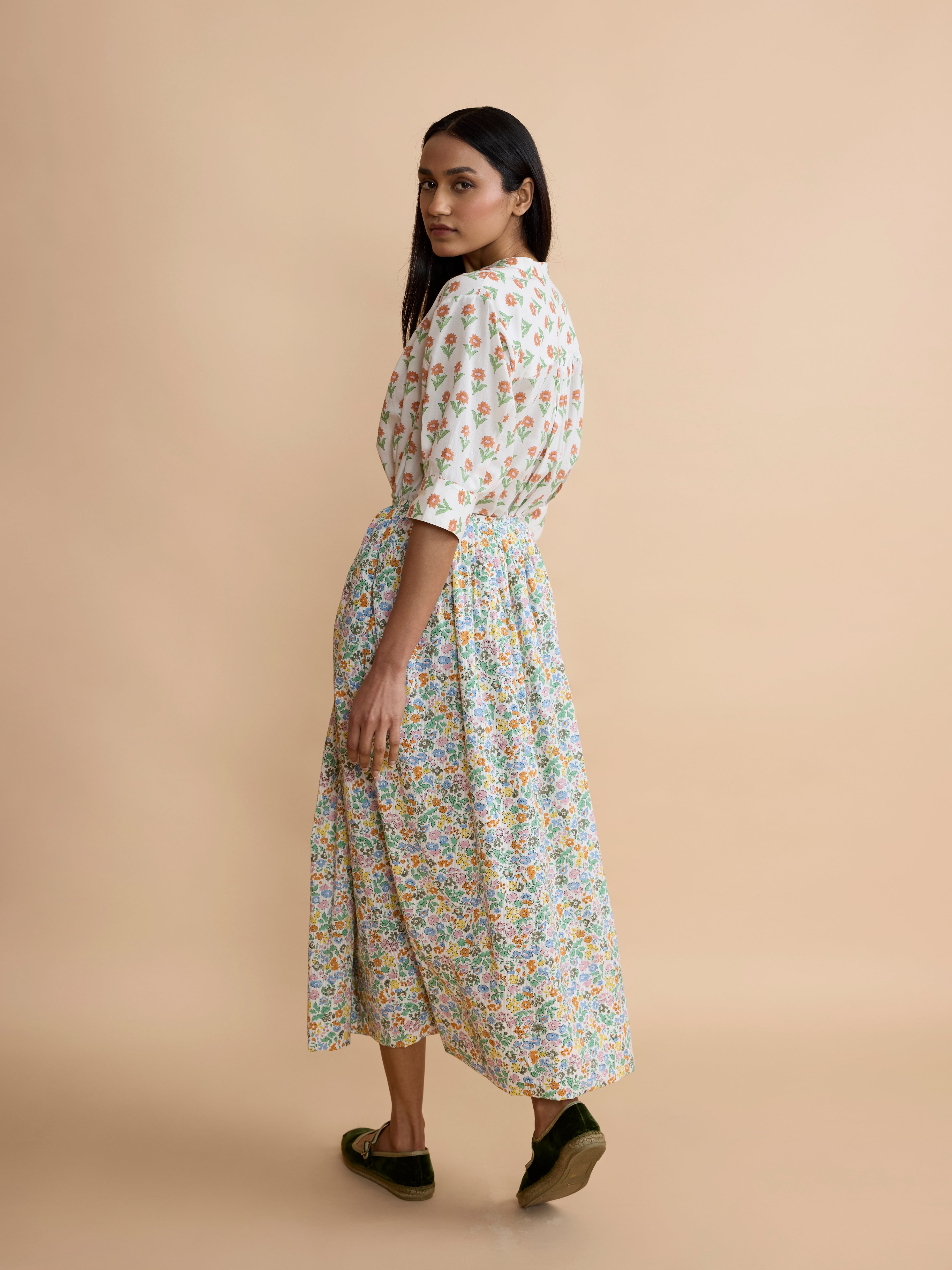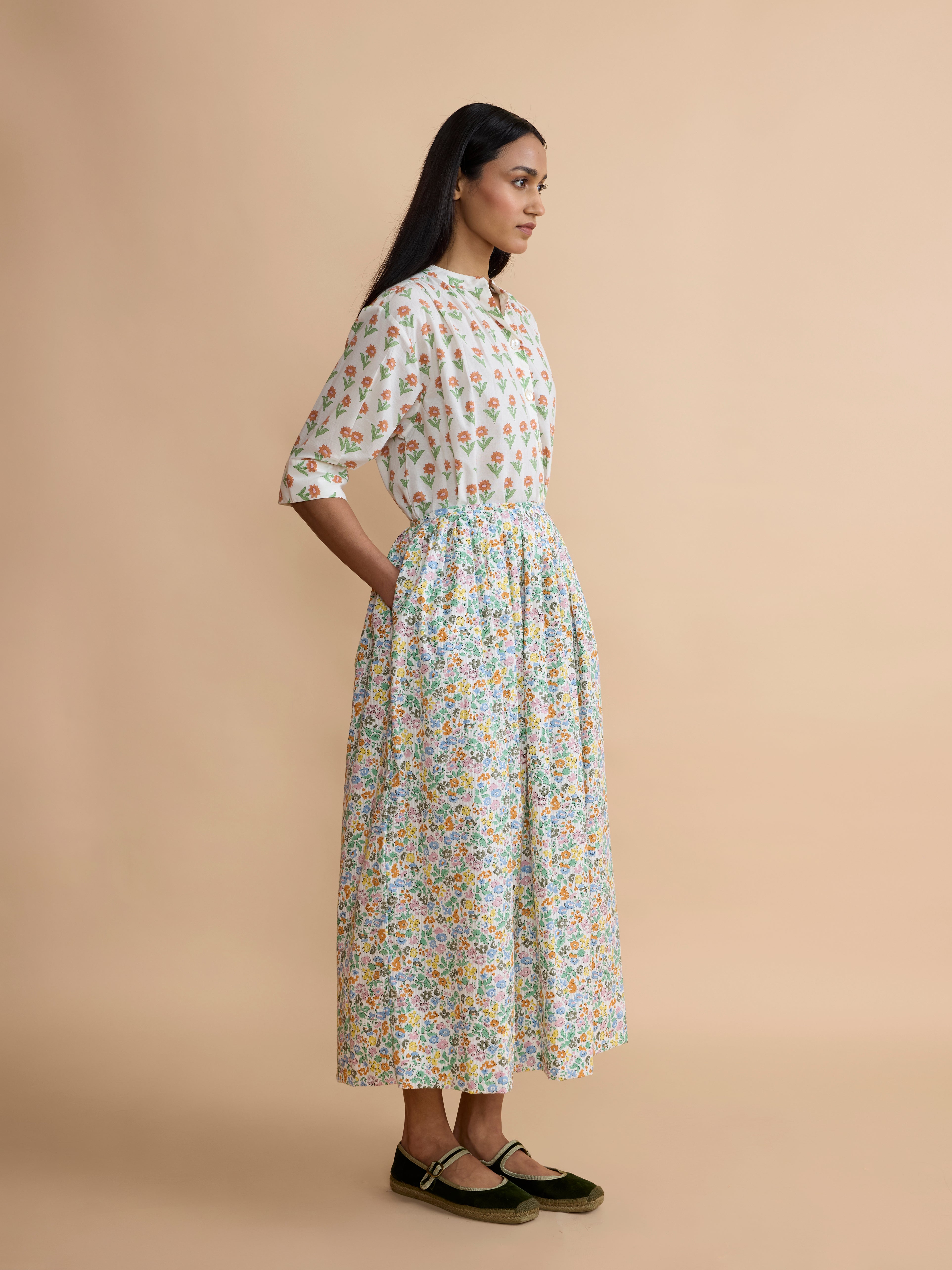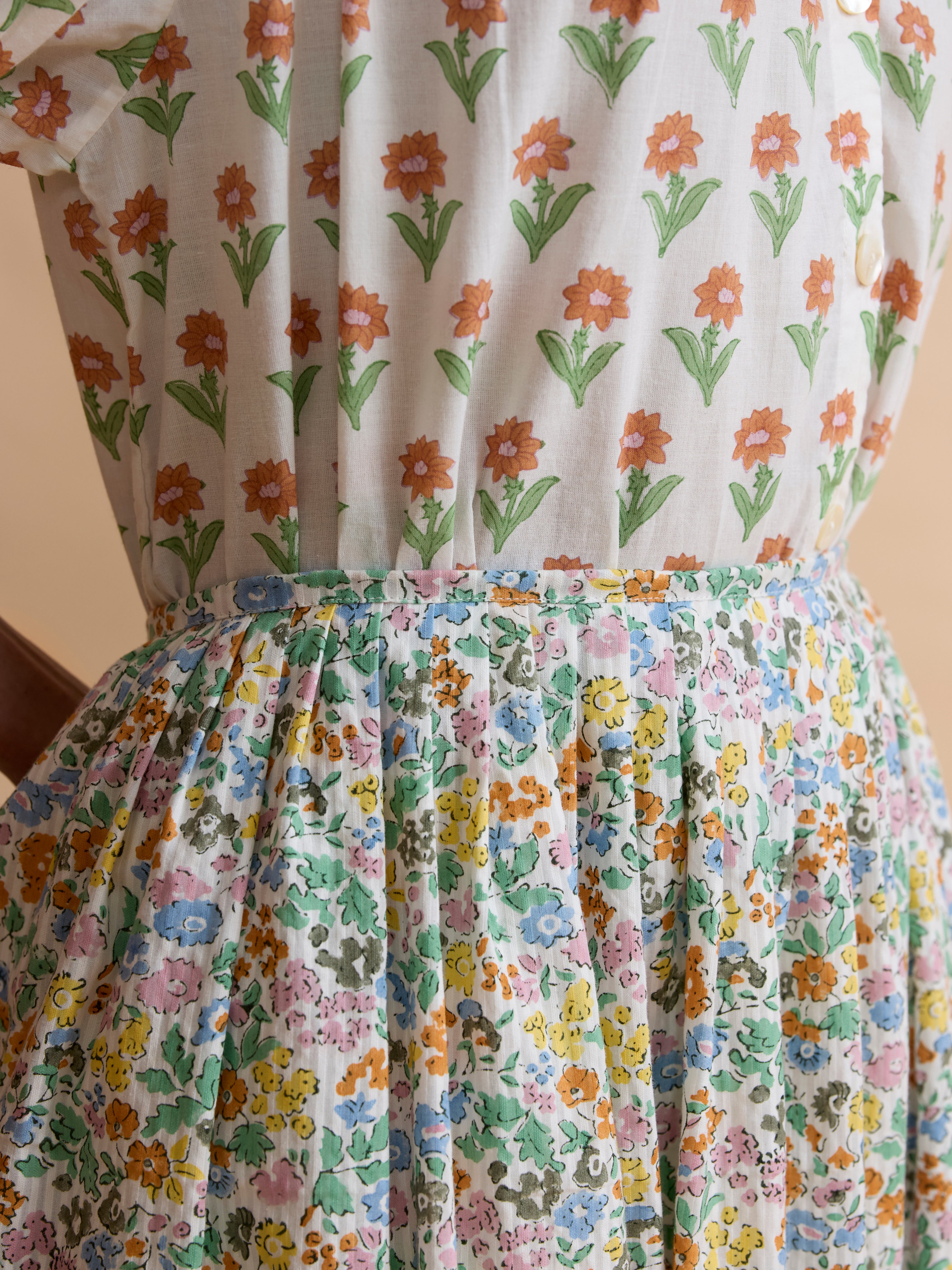 Our pretty and versatile Drew skirt, new for SS26. We love the deceptive simplicity of this piece - with its tiny waist pleats and expert blockprinting