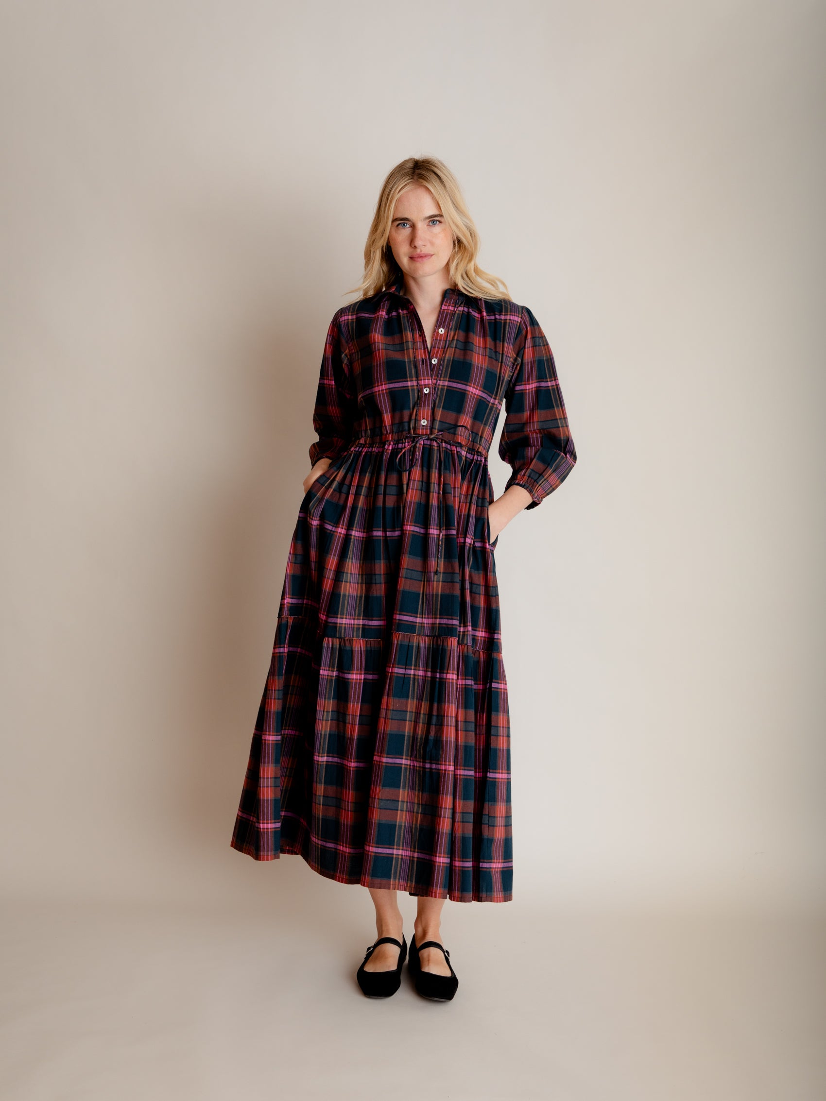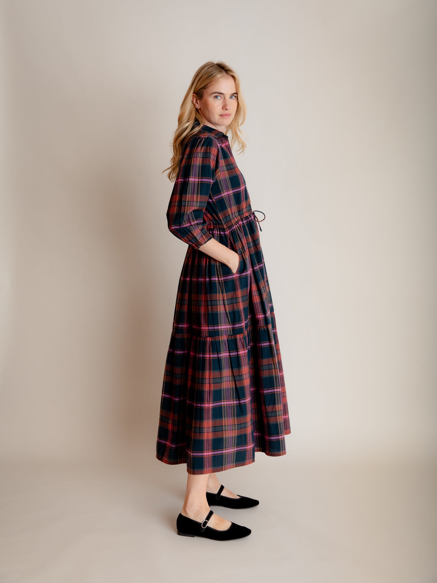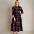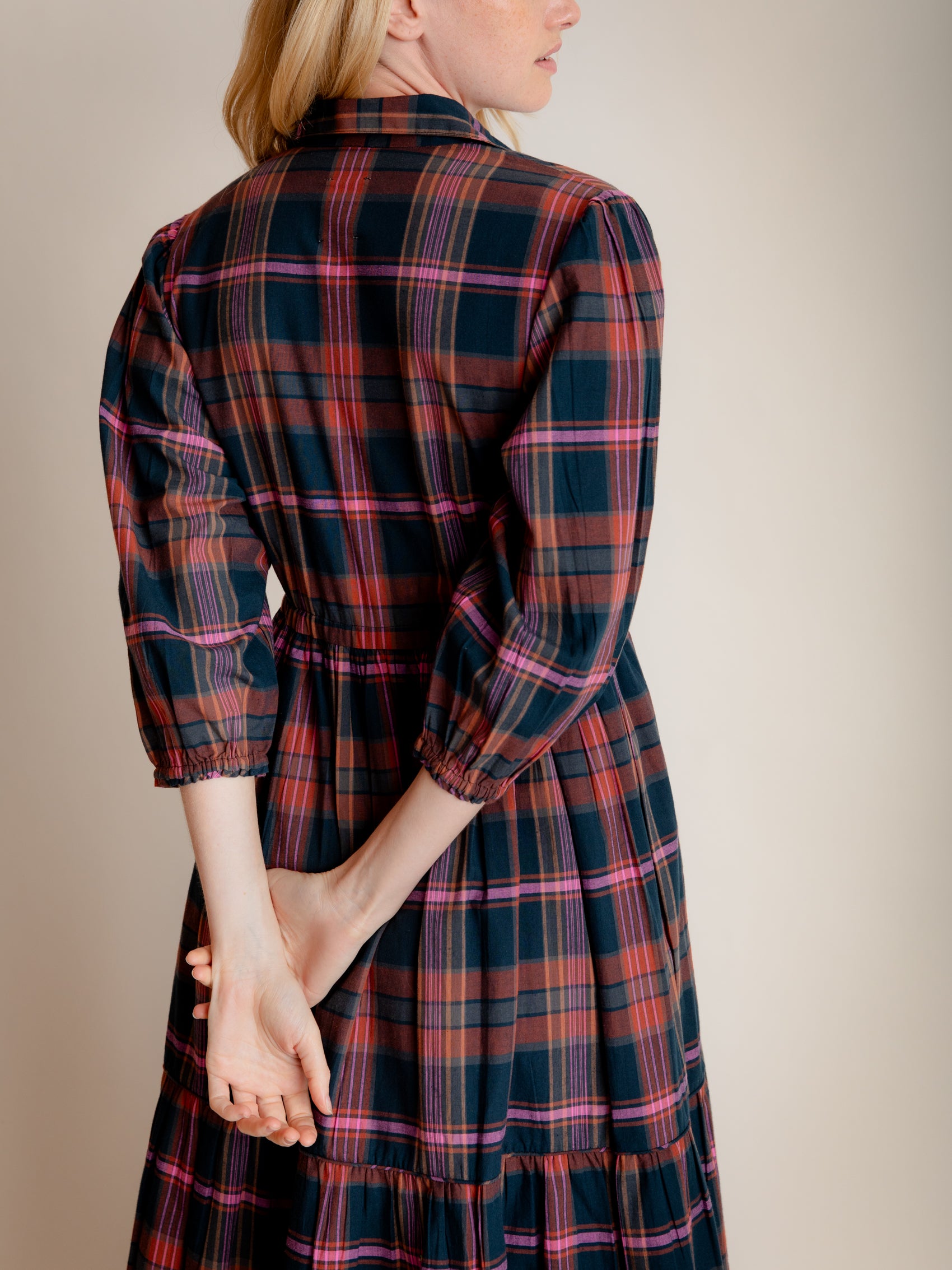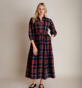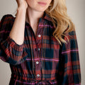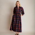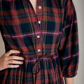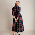 Our easy and elegant Lina is a simple shirt dress shape but with added oomph thanks to the generous volume of fabric in the skirt. A button down front, neat collar, waist tie and elastic cuffs provide the wearer with plenty of elements to play with. This fabulous autumn cotton check has a beautiful palette, perfect for mixing with your favourite warm layers.