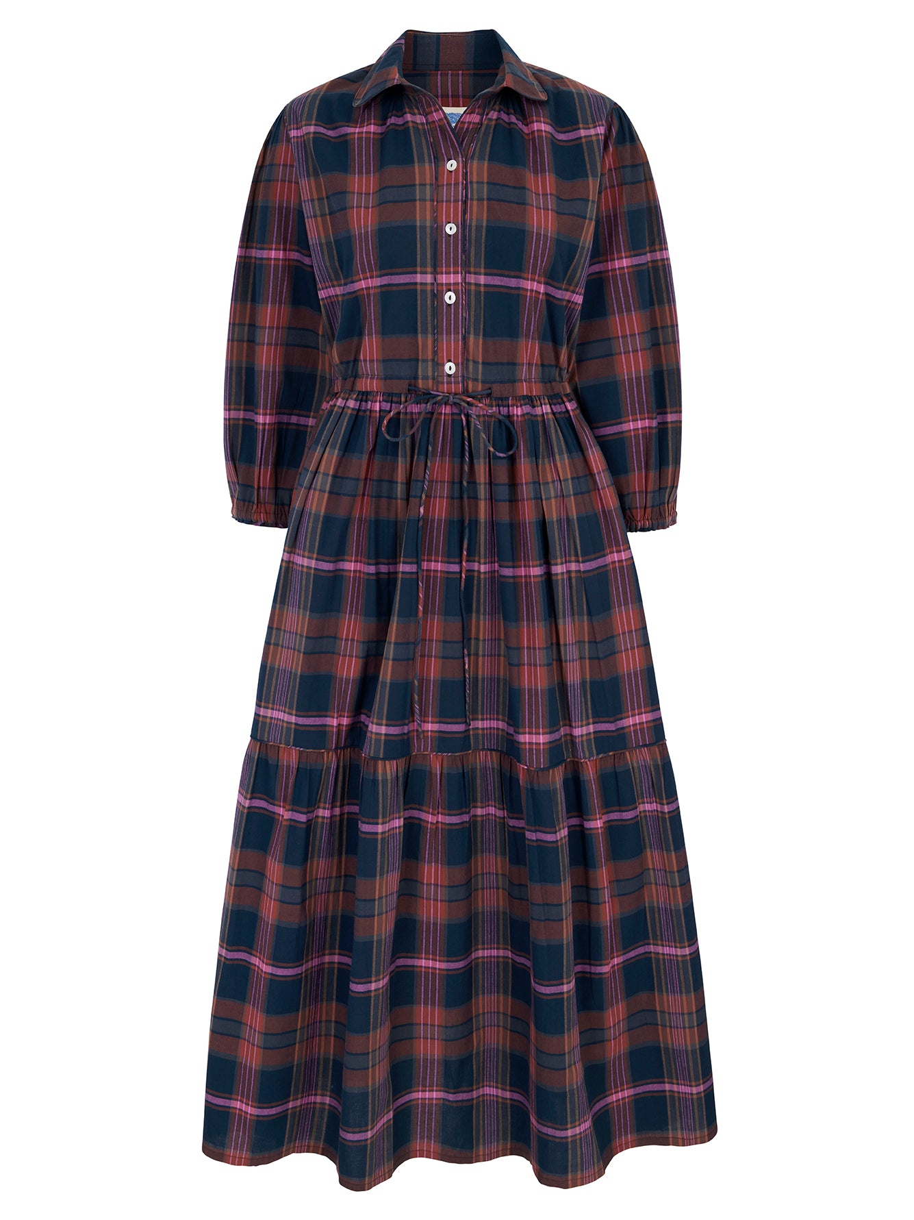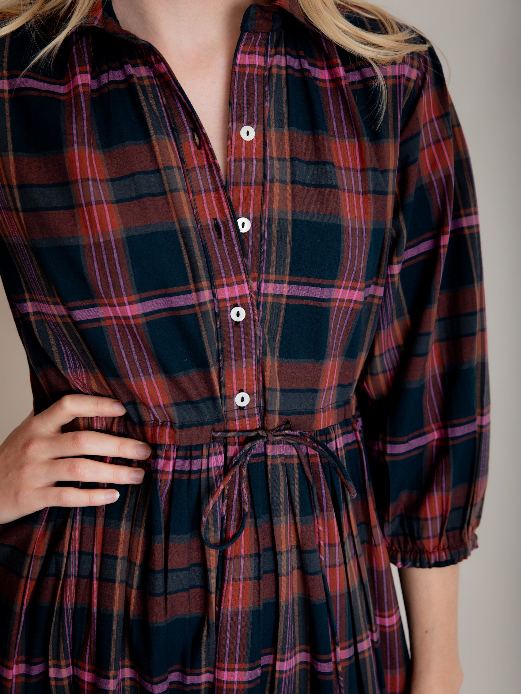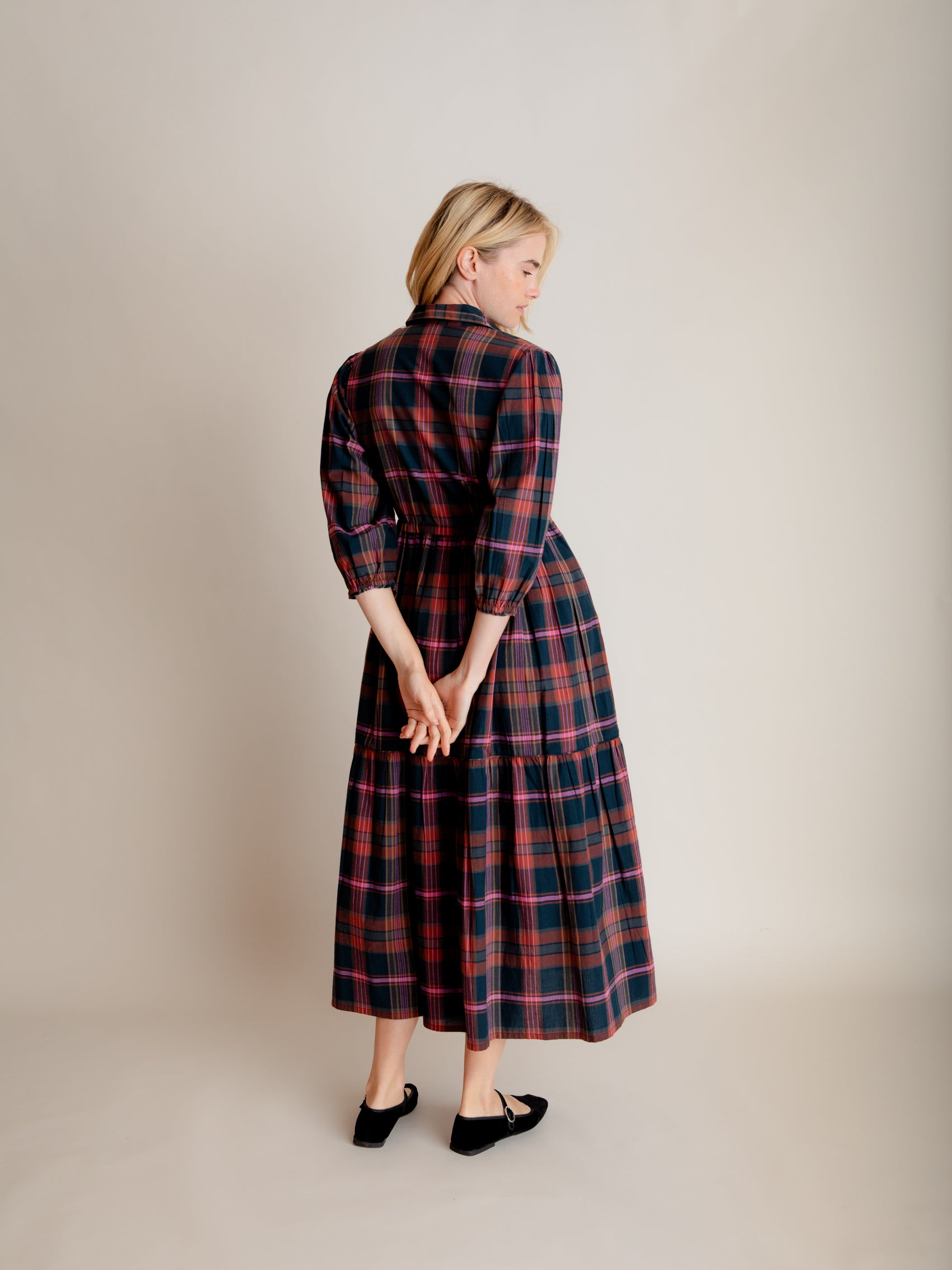 Our easy and elegant Lina is a simple shirt dress shape but with added oomph thanks to the generous volume of fabric in the skirt. A button down front, neat collar, waist tie and elastic cuffs provide the wearer with plenty of elements to play with. This fabulous autumn cotton check has a beautiful palette, perfect for mixing with your favourite warm layers.