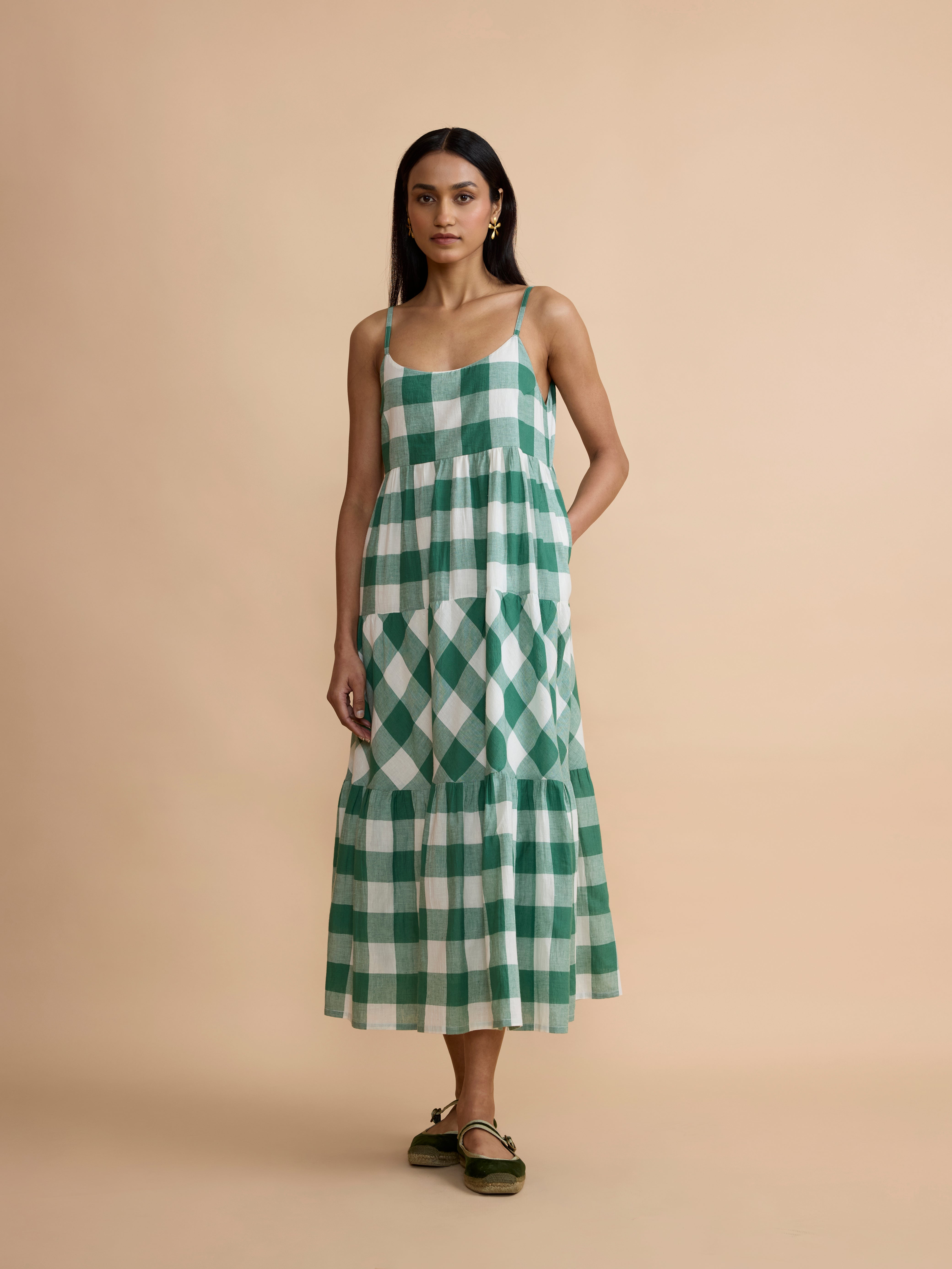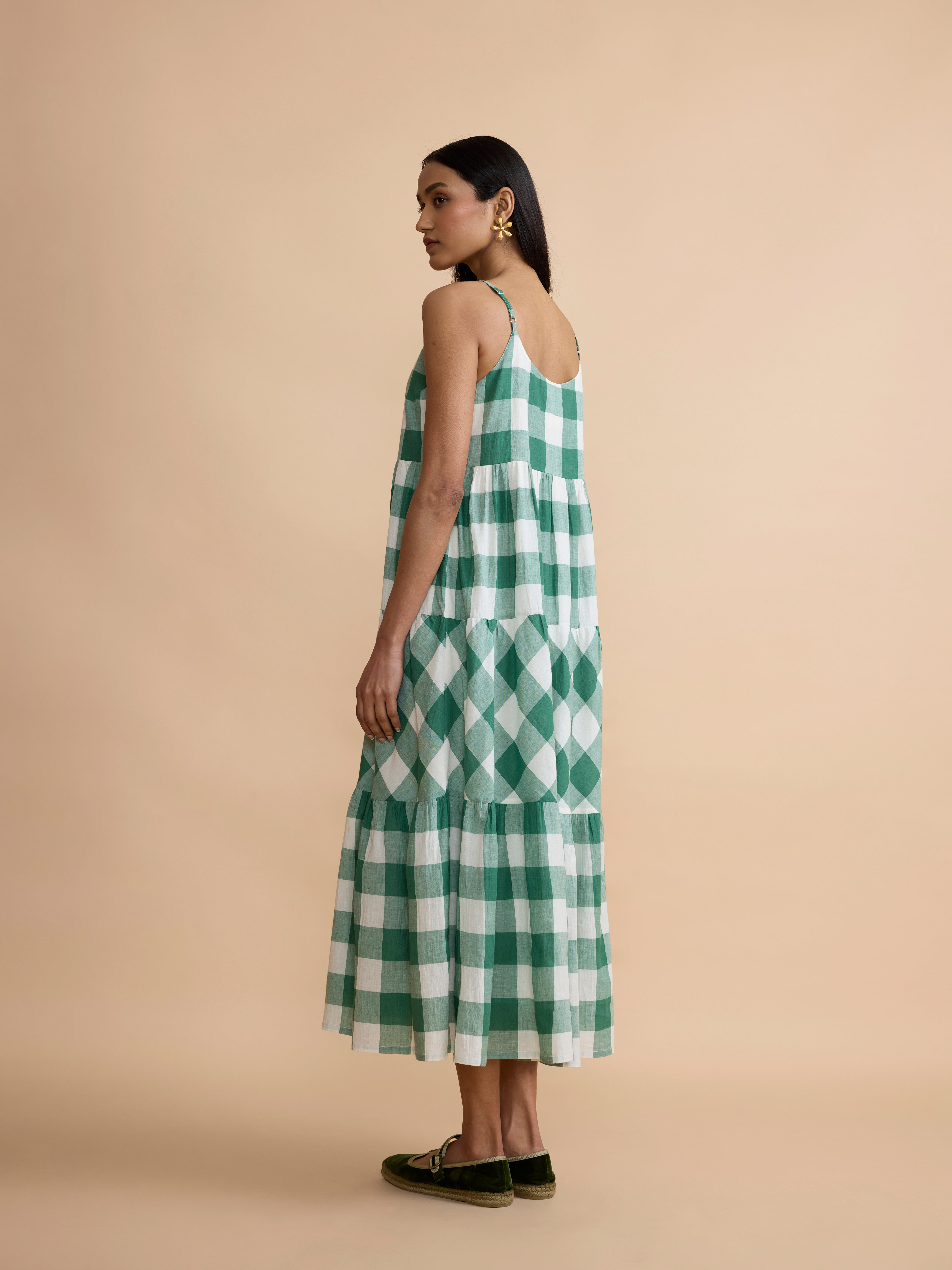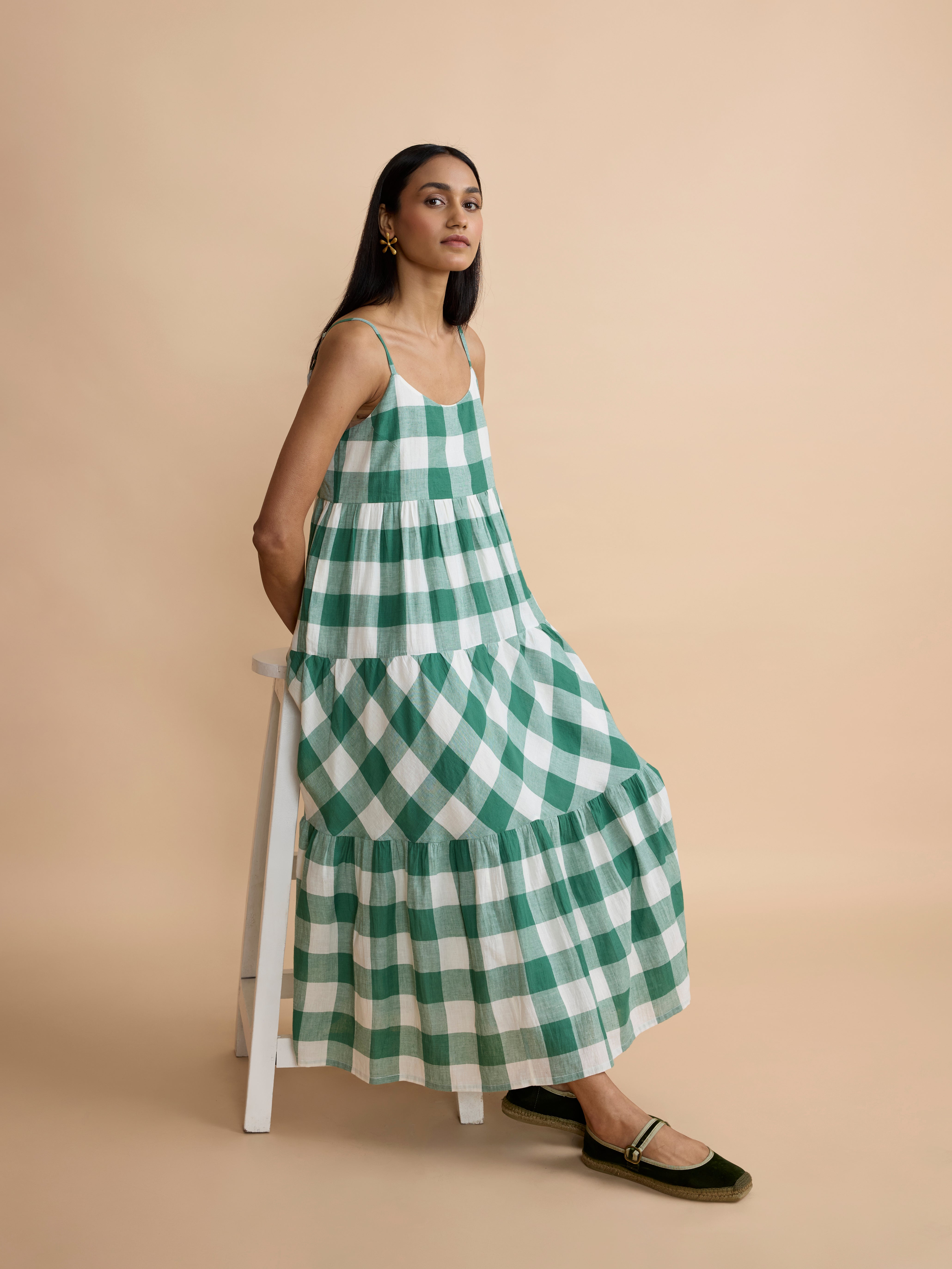 The fabric for this dress is a supremely soft, green cotton check, woven especially for us.