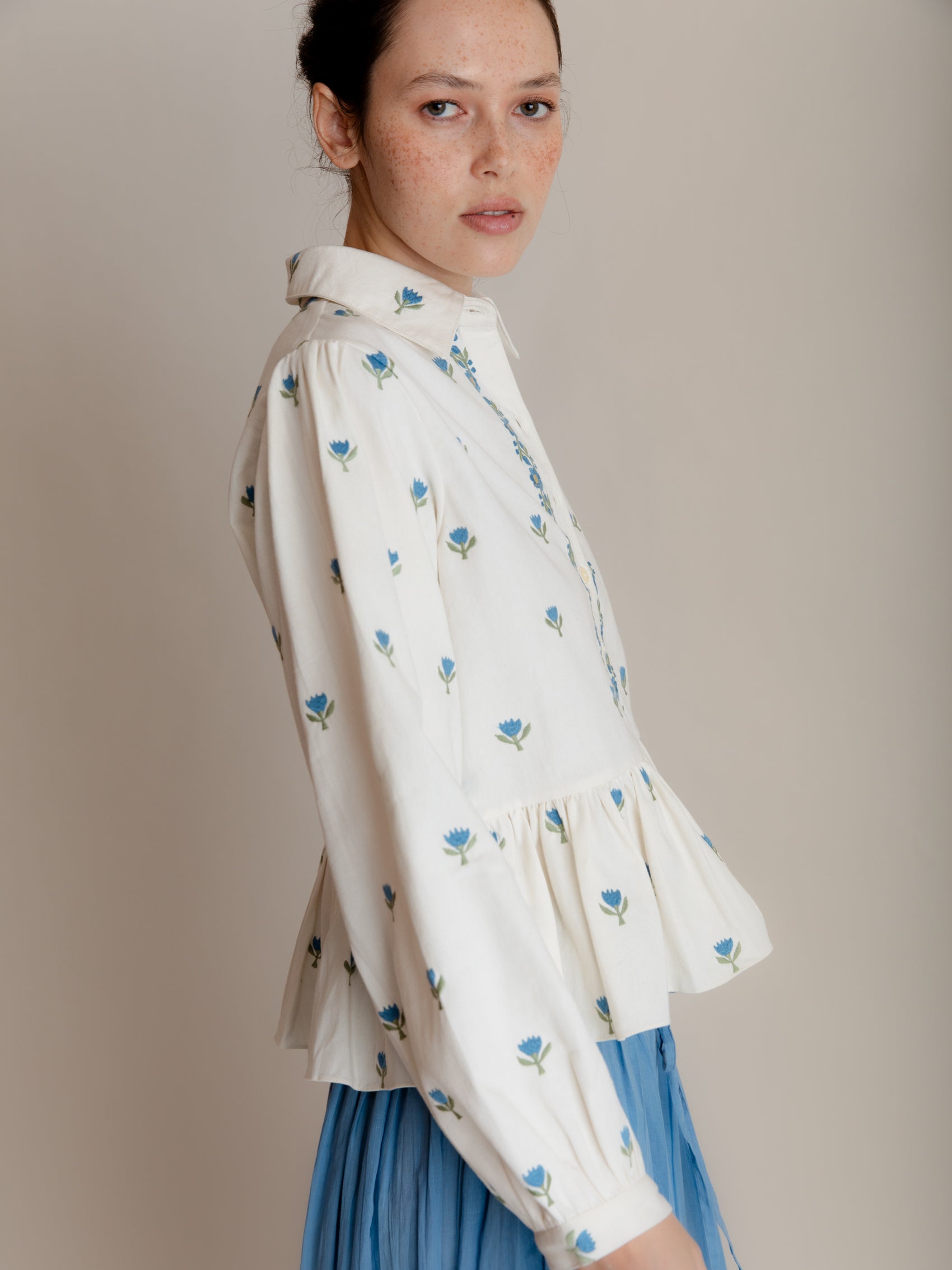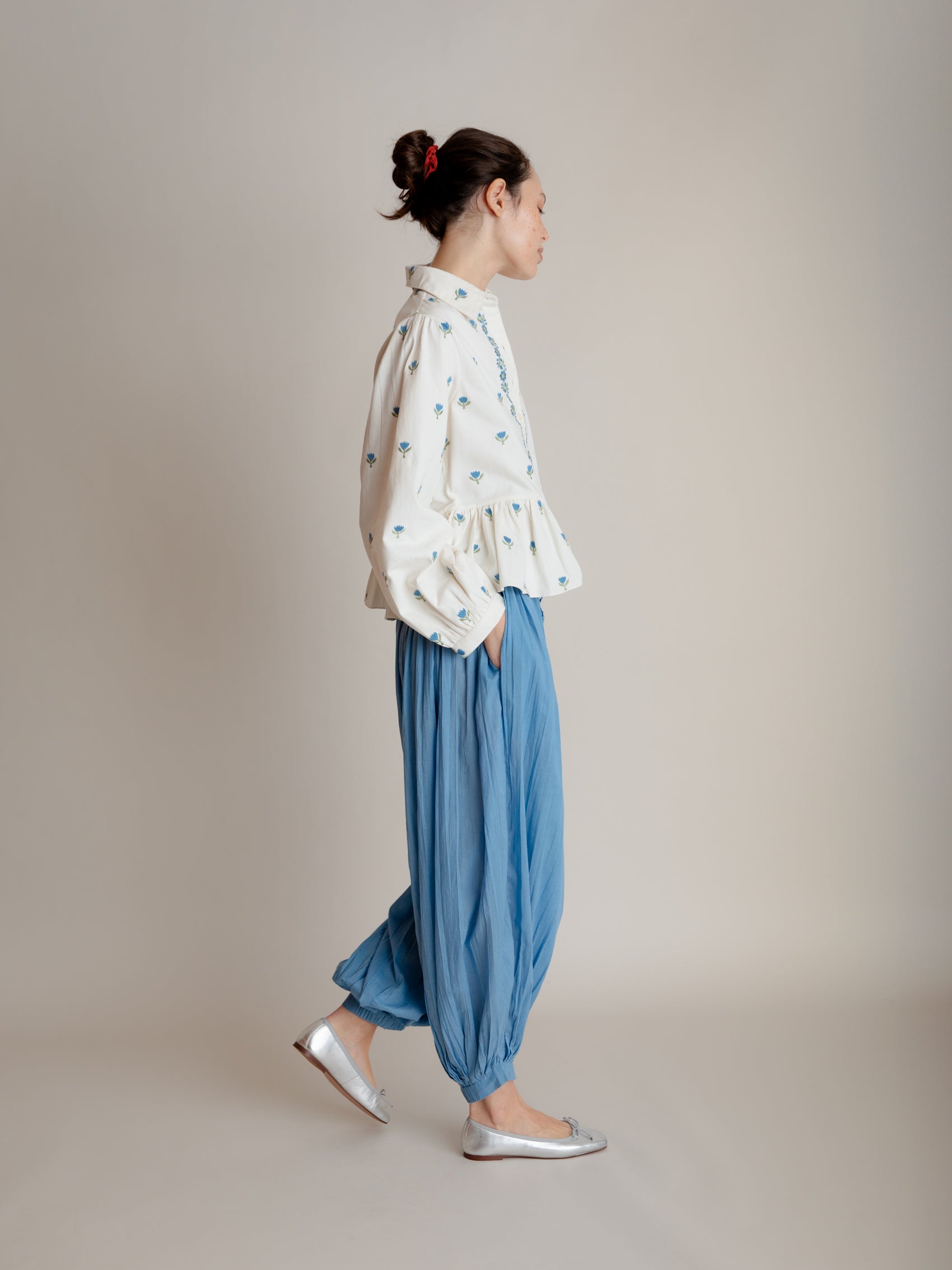 The Pascale shirt in cotton twill has a great structure and shape. For SS26 we have created this very pretty embroidered version. Wear with denim, or a pretty summer skirt.